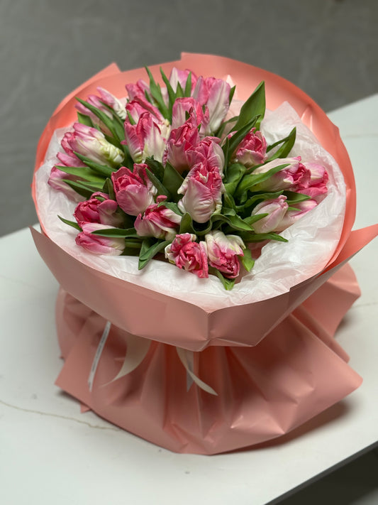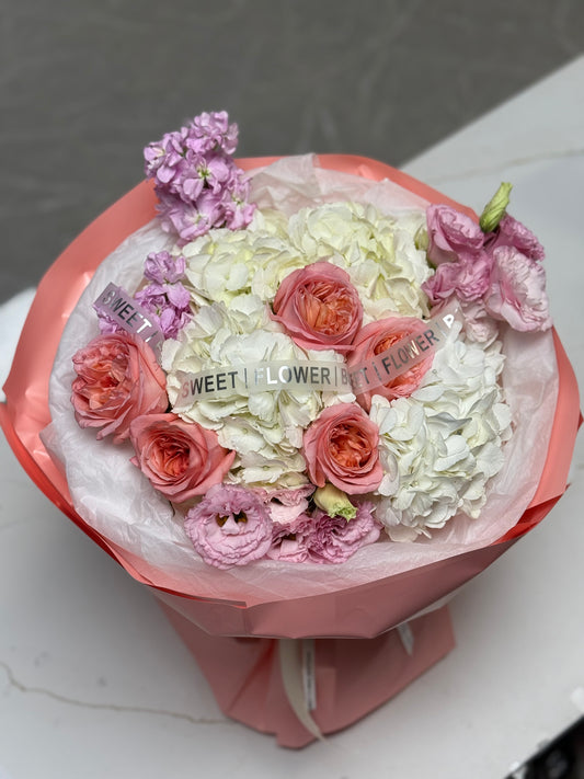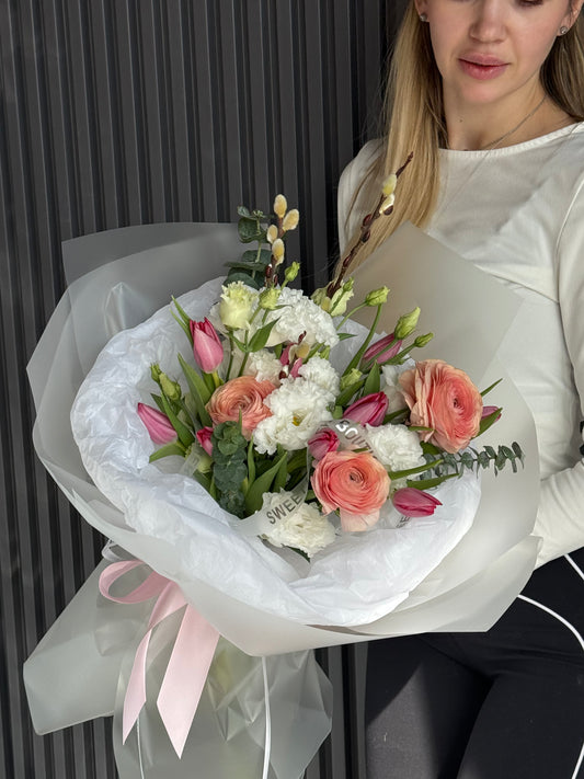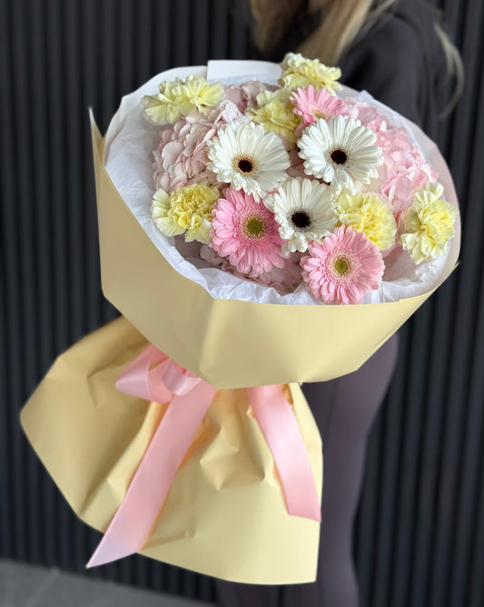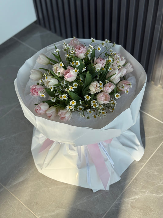 Fresh seasonal flower arrangements wrapped in trendy waterproof paper.