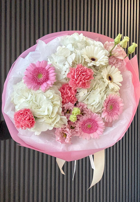 Fresh seasonal flower arrangements wrapped in trendy waterproof paper.