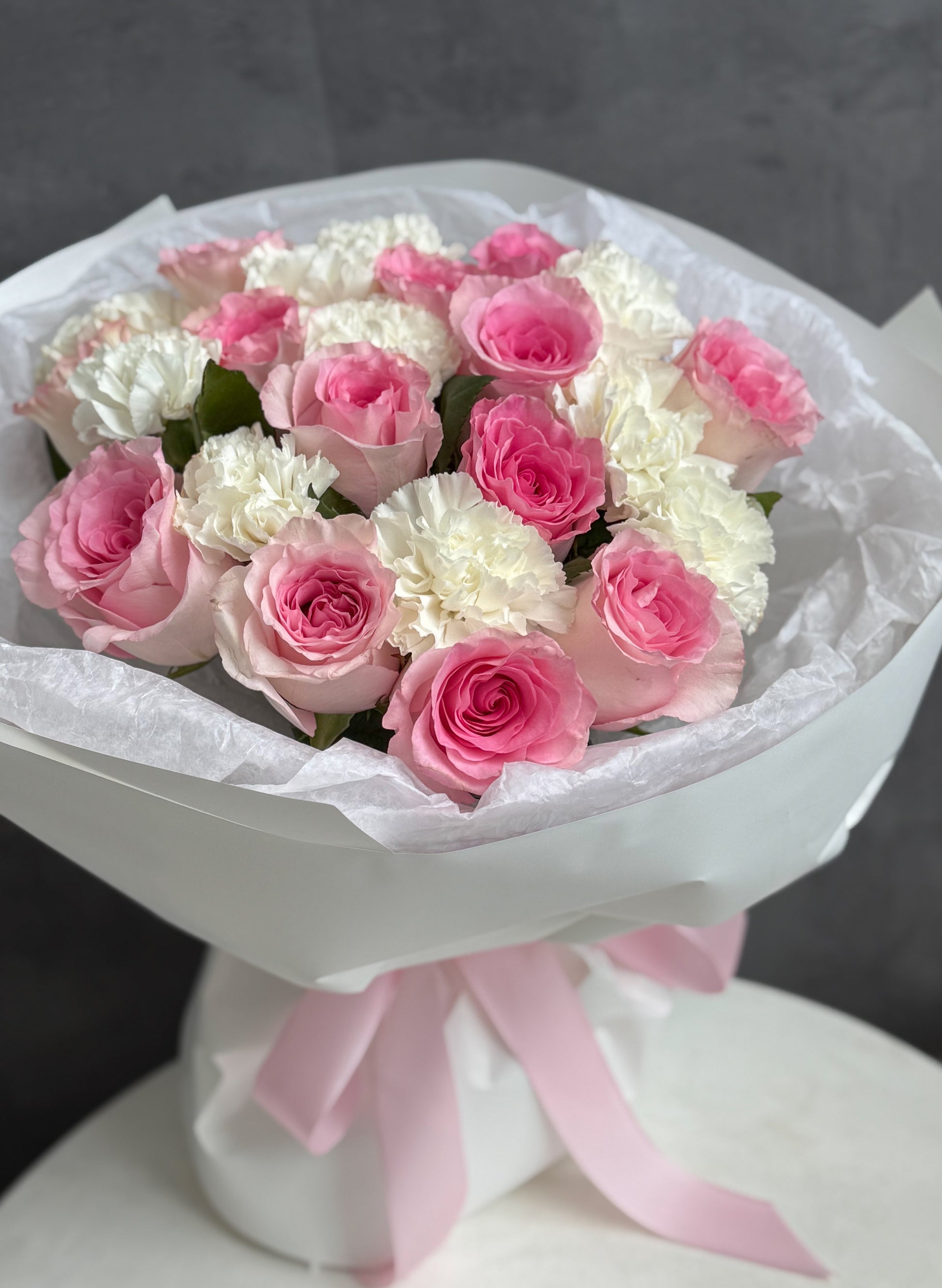 Introducing our enchanting flower bouquet, a delightful combination of premium pink roses and elegant white carnations, beautifully wrapped in crisp white paper. This exquisite arrangement is designed to capture hearts and elevate any occasion, making it the perfect gift for birthdays, anniversaries, or simply to brighten someone's day.