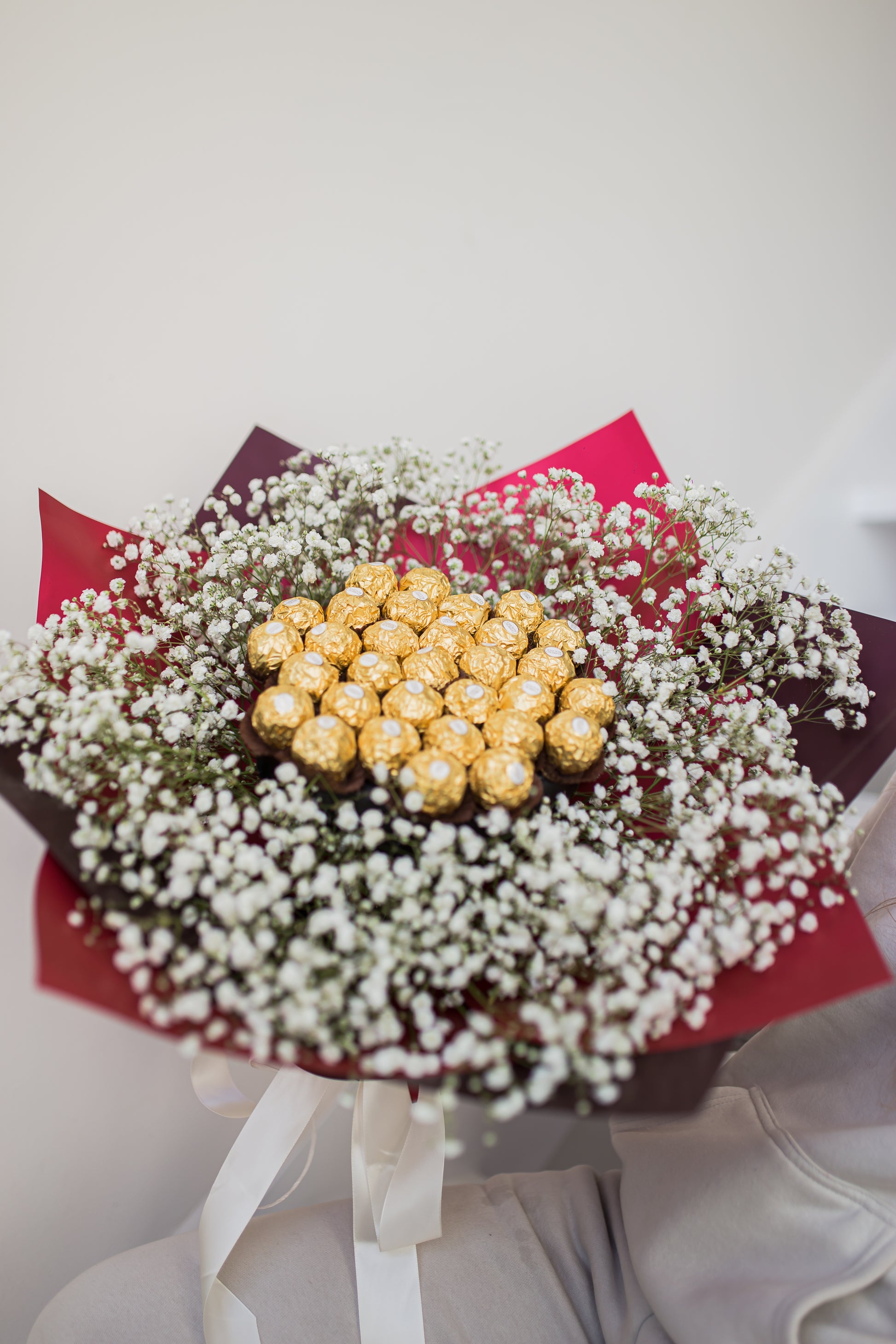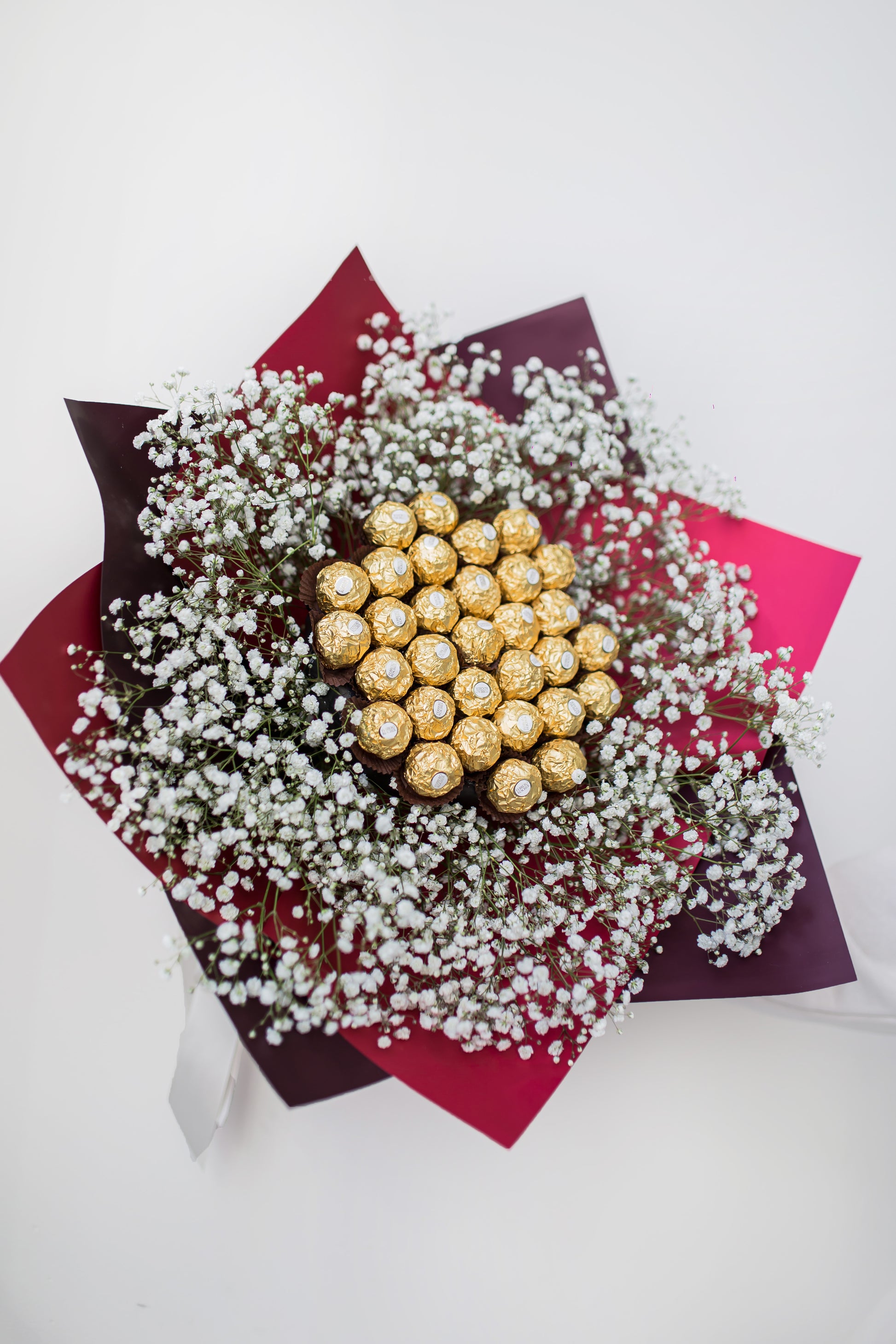 We combined our favorite Ferrero Rocher chocolates and delicate baby-breath flowers in one bouquet. This simple arrangement surprises our many clients as you can enjoy flowers while eating sweets.