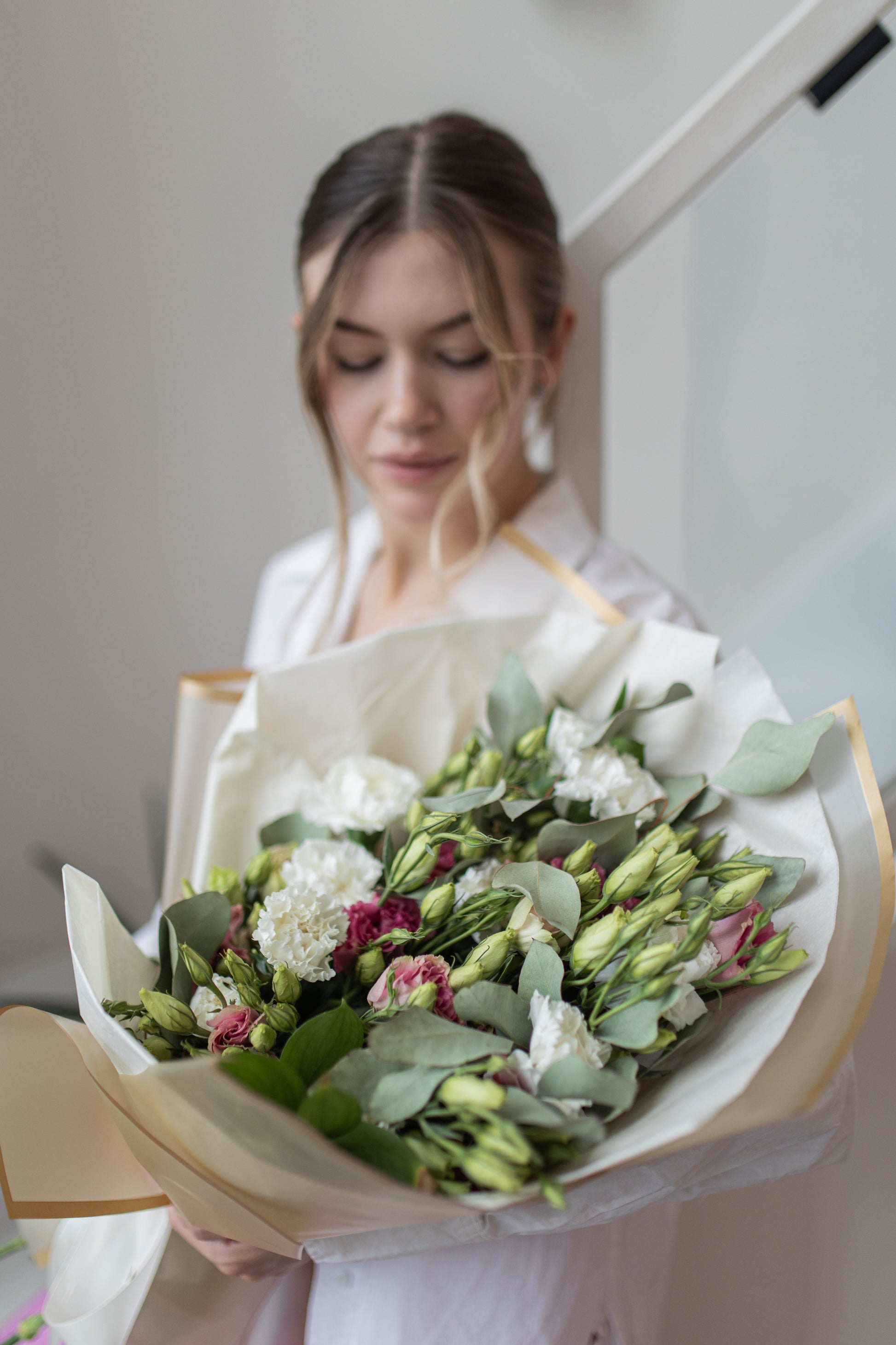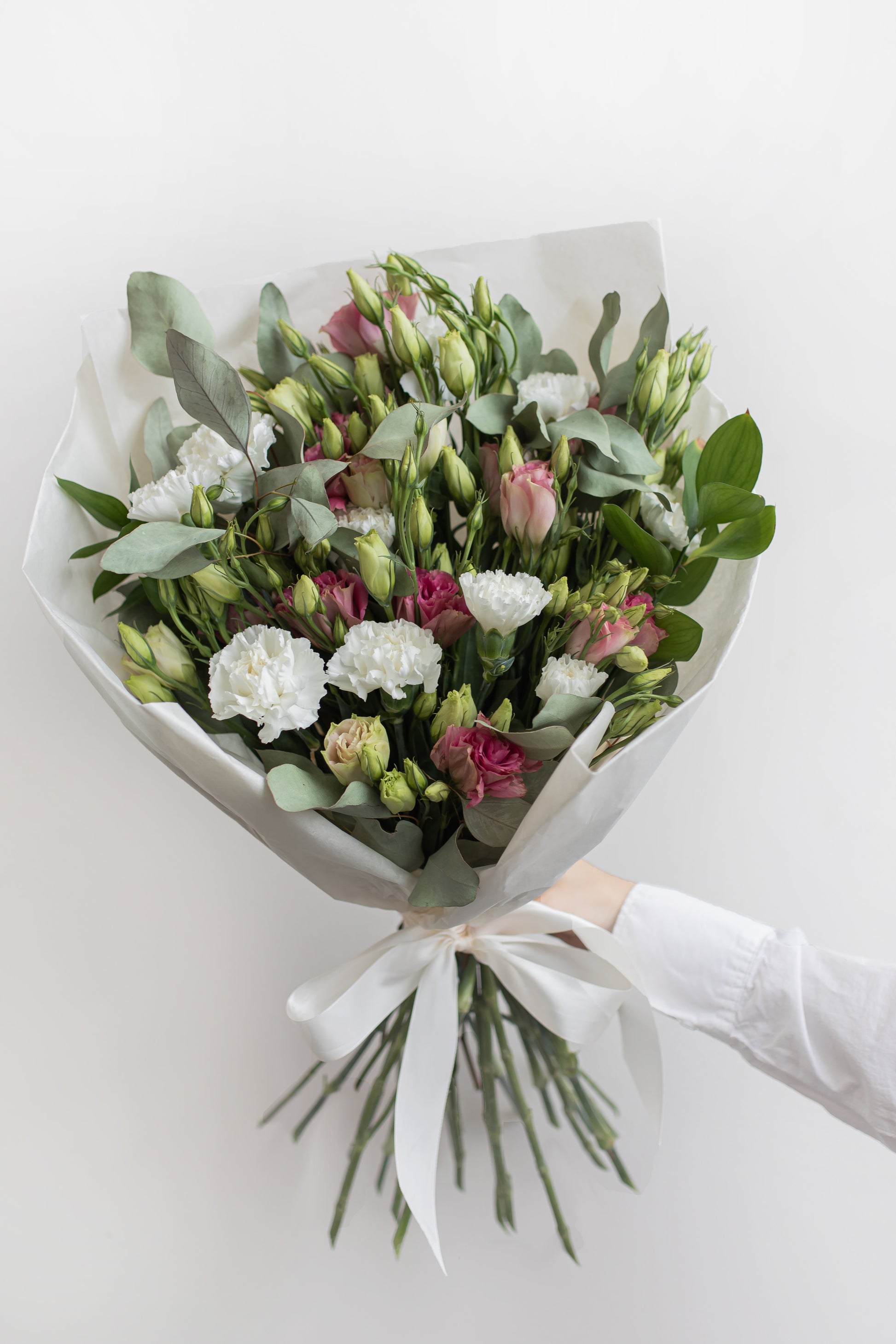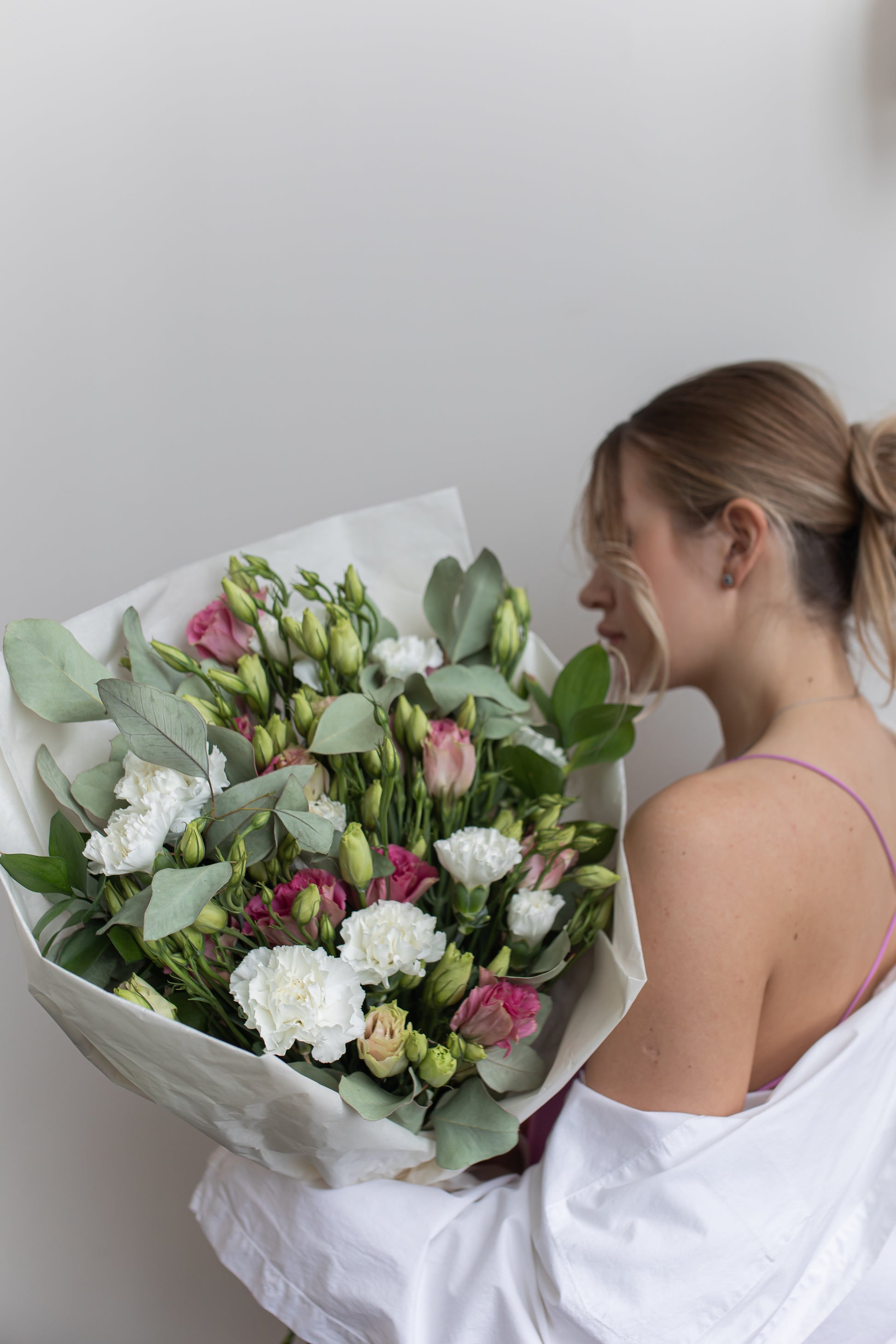 Eustoma pink flowers with a touch of white carnations. Usually, eustoma (lisianthus) comes with most of its blooms closed, after a couple of days in a vase you will discover them beautifully opening.