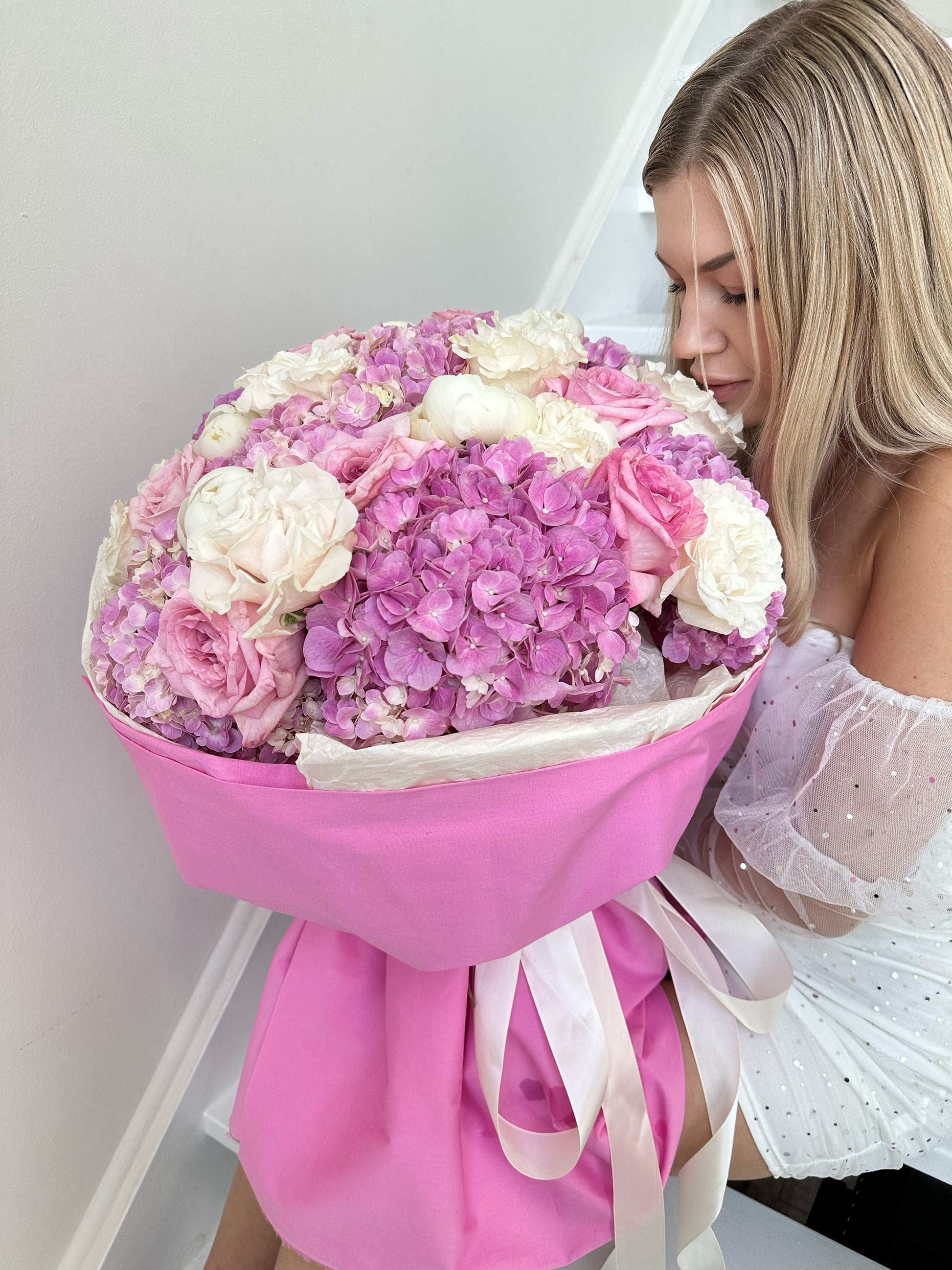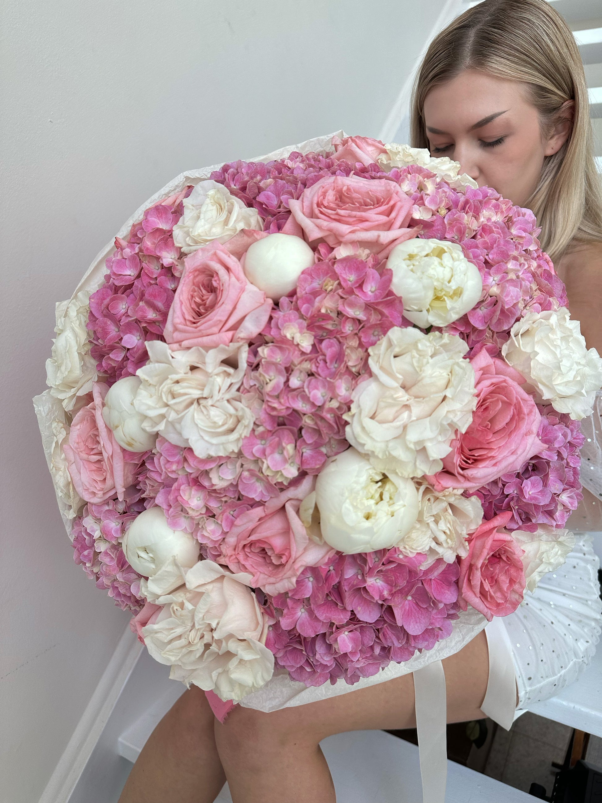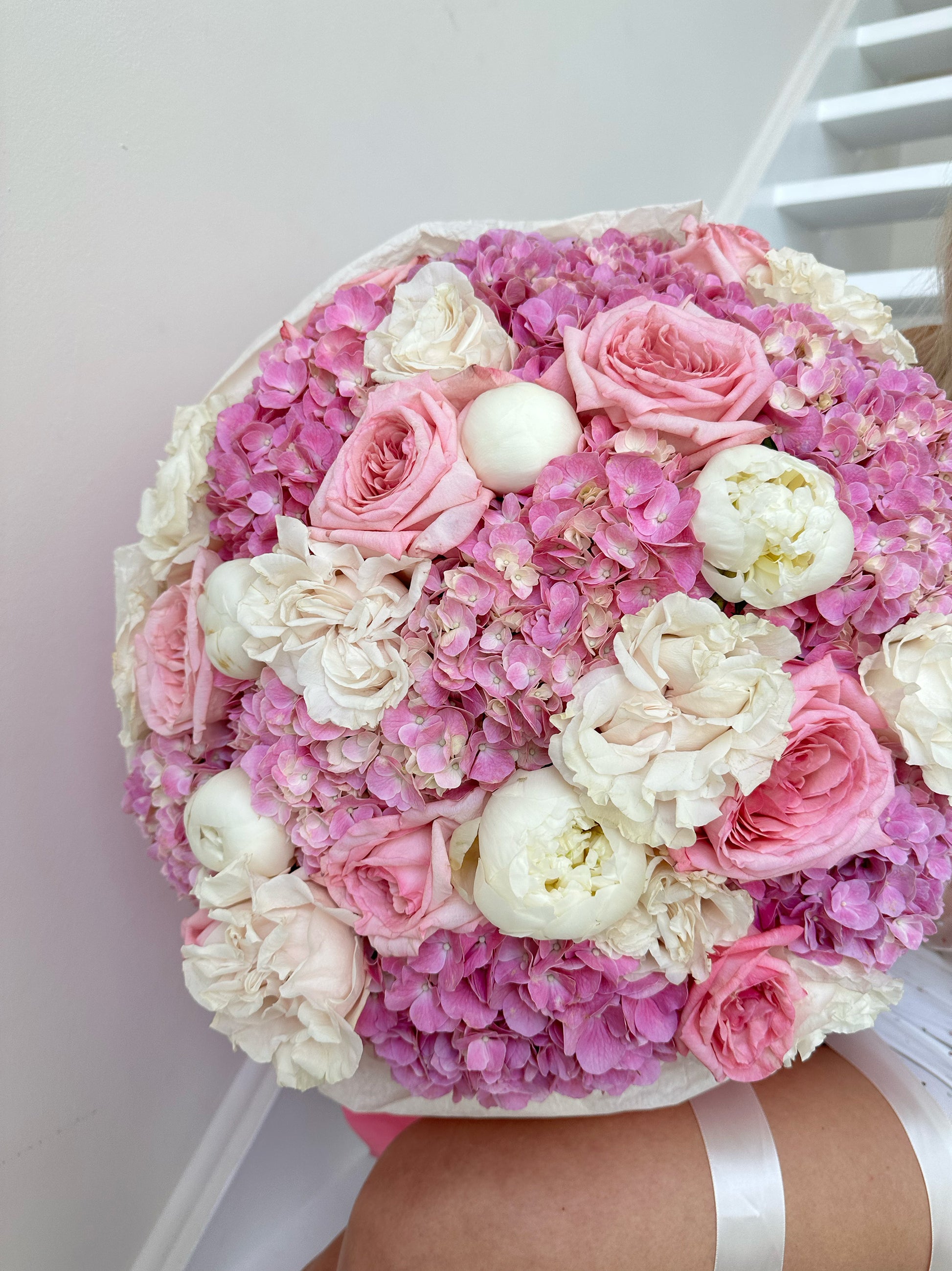 This bouquet is the dream of every girl. We combined voluminous hydrangeas, pink and white roses, and pionies in a large and tender bouquet wrapped in pink fabric. We use special sorts of roses that are bigger than usual to create volume and a great scent for the bouquet. Please note, that when peonies are out of season, we add extra roses instead.