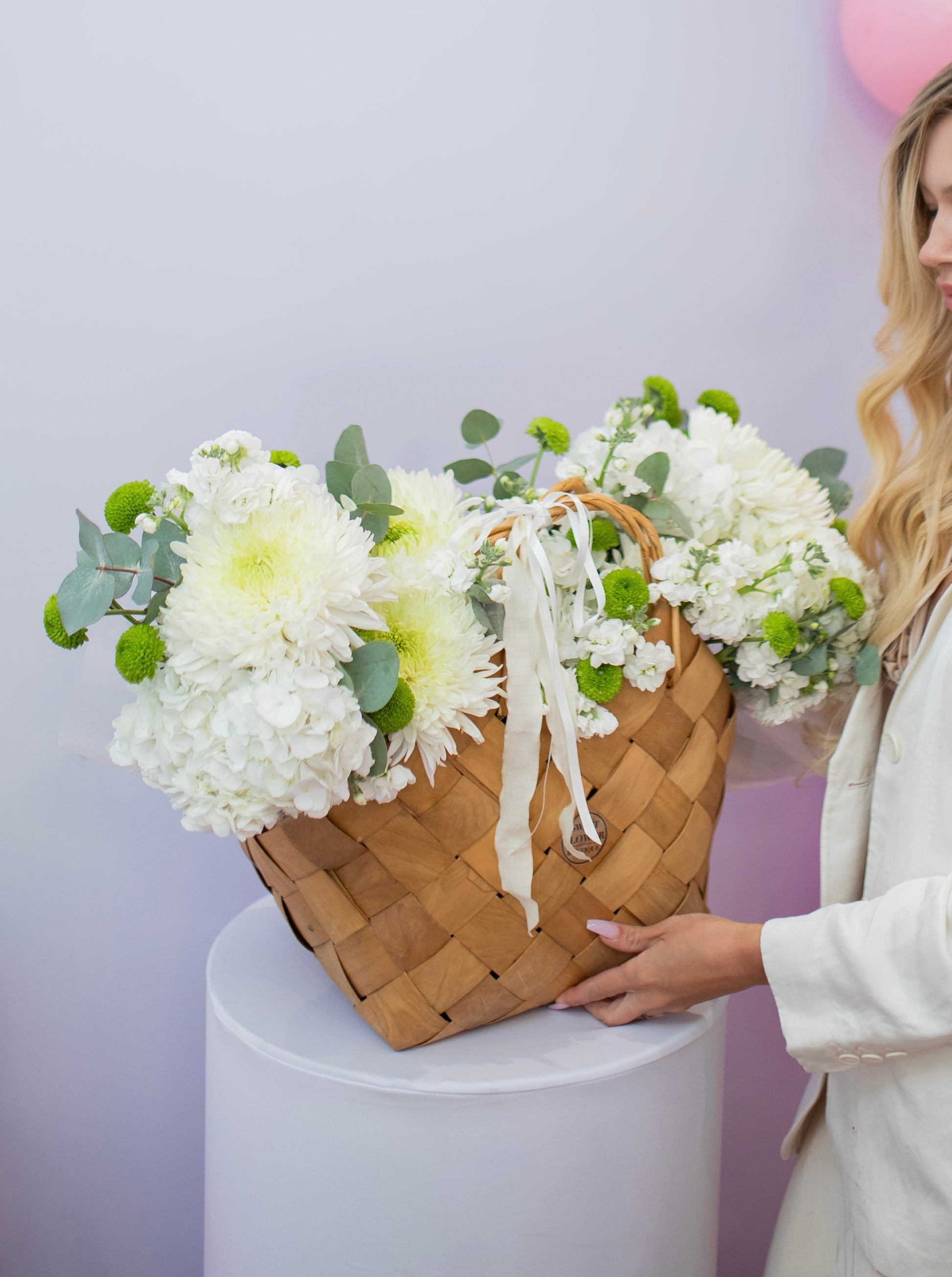 Bring timeless beauty into any space with our luxury white elegance basket, exclusively designed by Sweet Flower Boutique. This handcrafted arrangement features lush white hydrangeas, chrysanthemums, delicate stock flowers, and accents of fresh greenery – all artfully arranged in a woven keepsake basket.