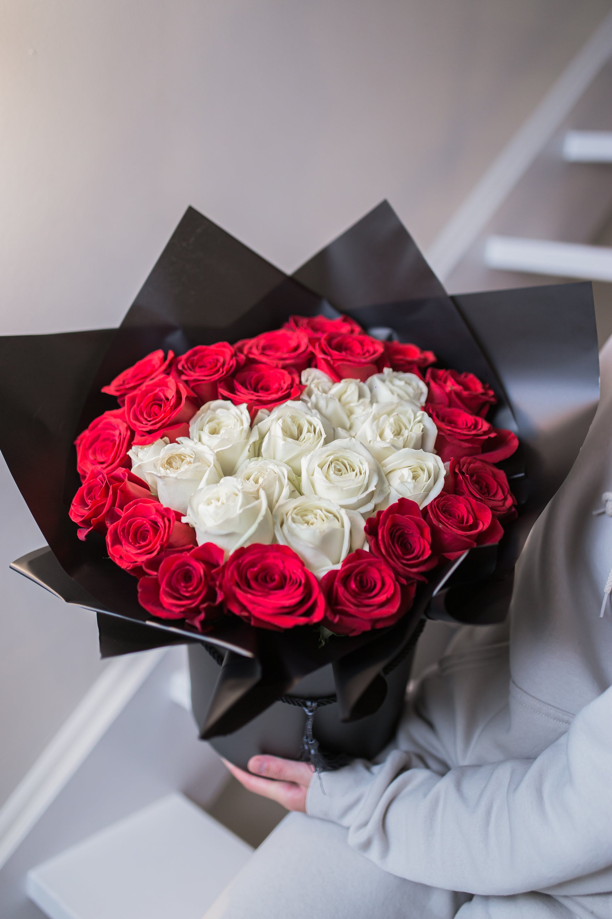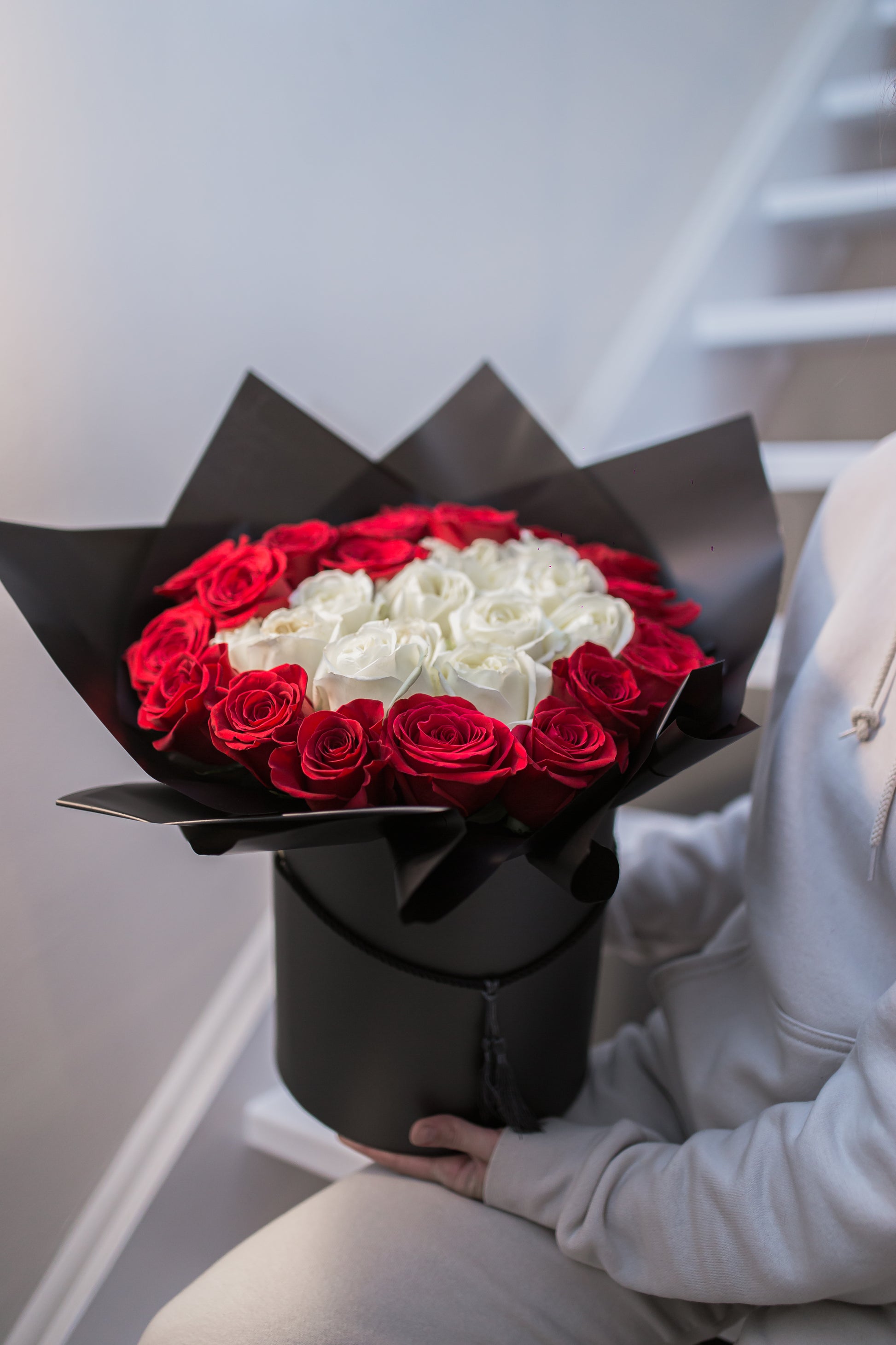 The best way to show your love. Our exclusive arrangement is with red and white roses in a luxury black box. Our roses are premium quality imported from Ecuador and Columbia.