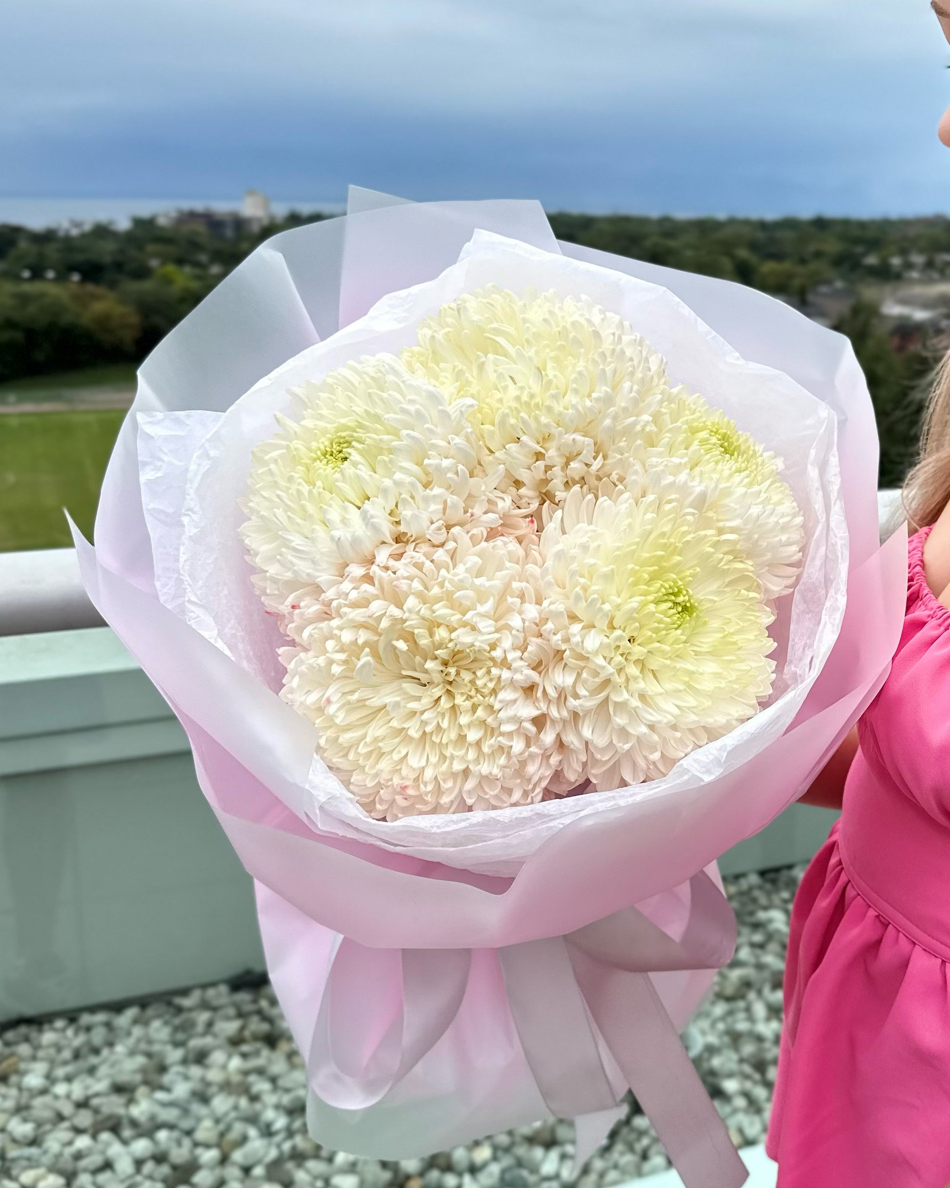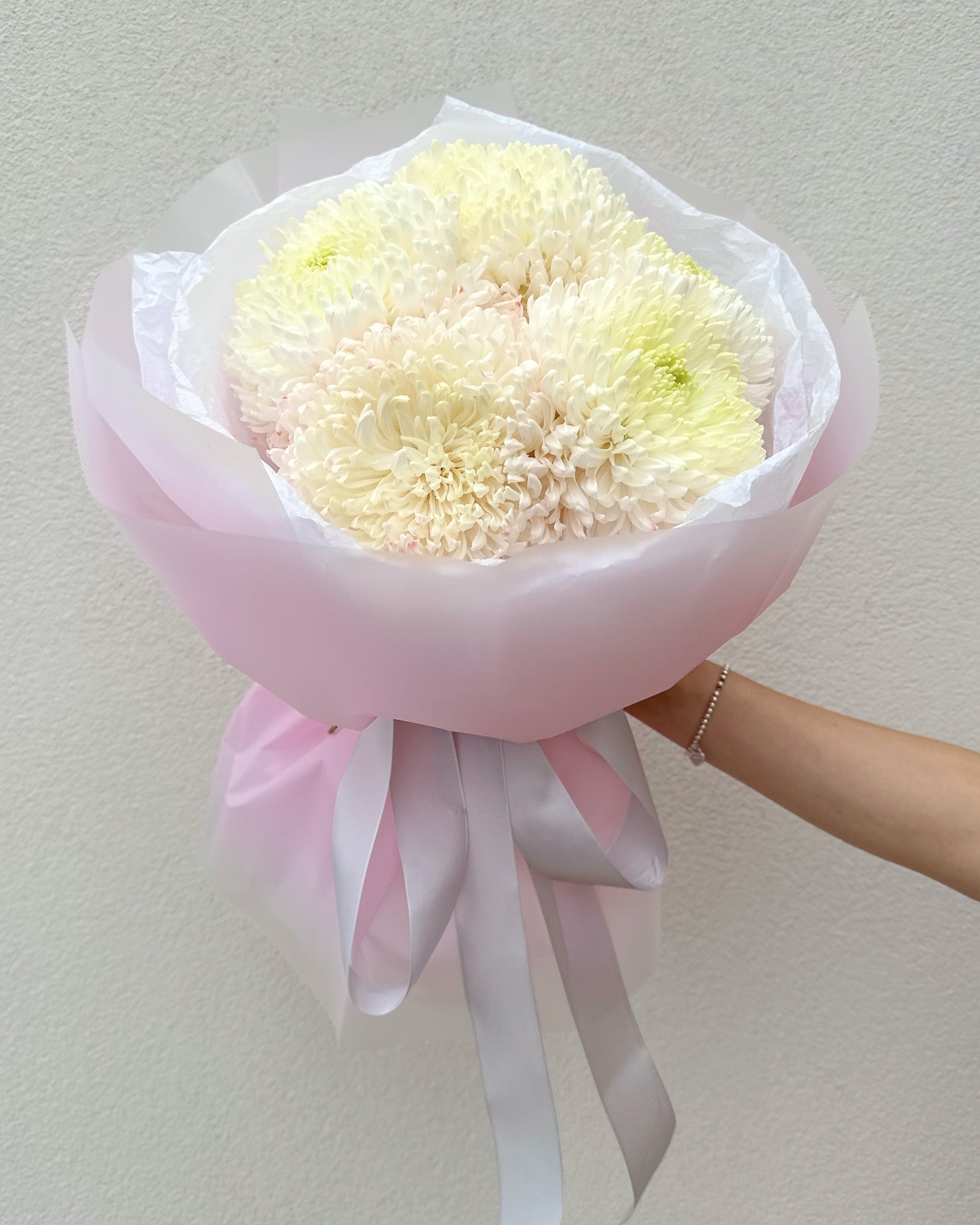 A mono bouquet with 5 volume chrysanthemums wrapped with light pink paper wrap. Simple and beautiful flower bouquets for any occasion.