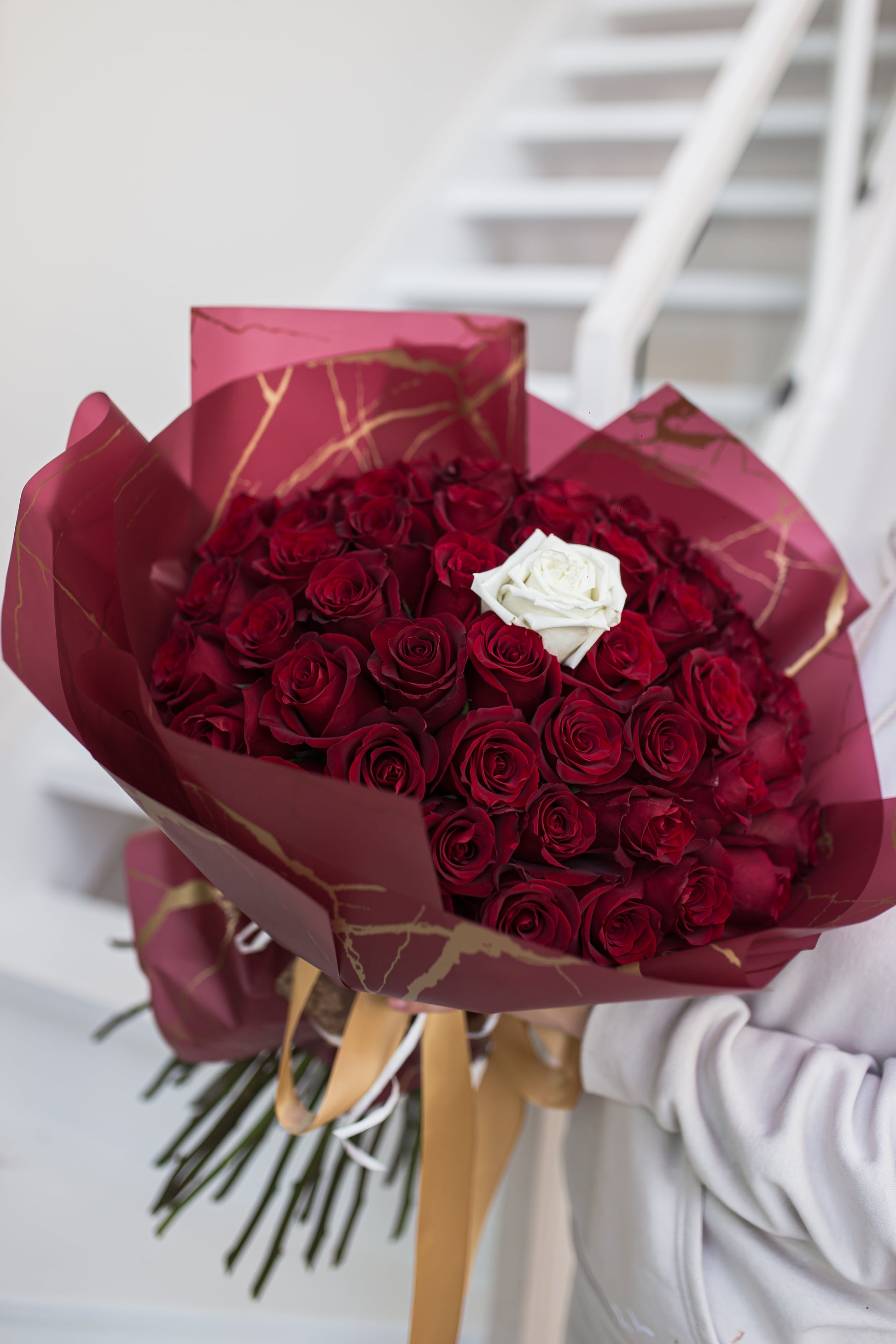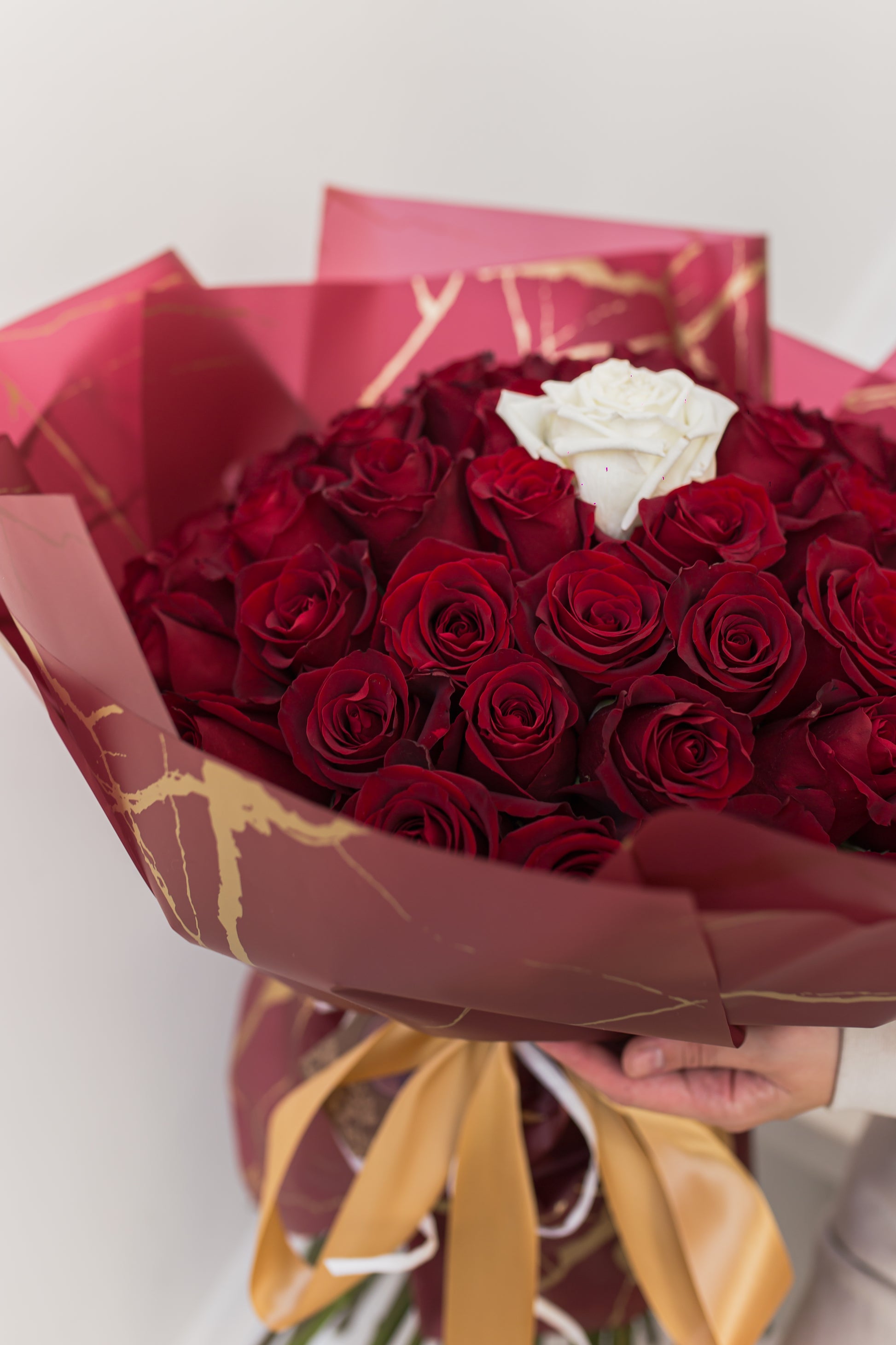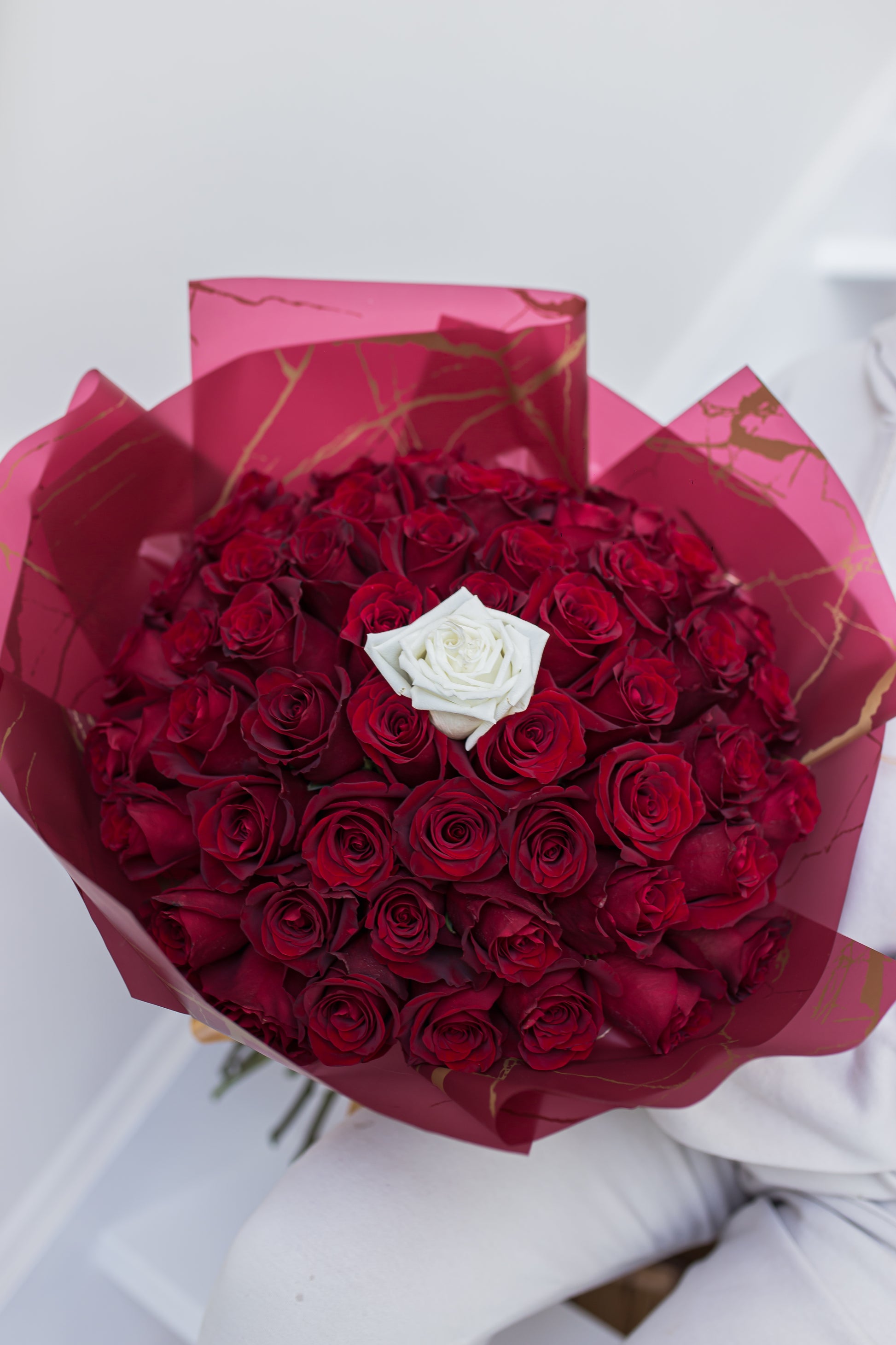 50 premium red roses with an accent of 1 white rose in the middle. All our flowers are fresh and imported from Ecuador and Columbia. The arrangement is wrapped with waterproof paper and silky ribbon. Such a great way to surprise your loved ones.