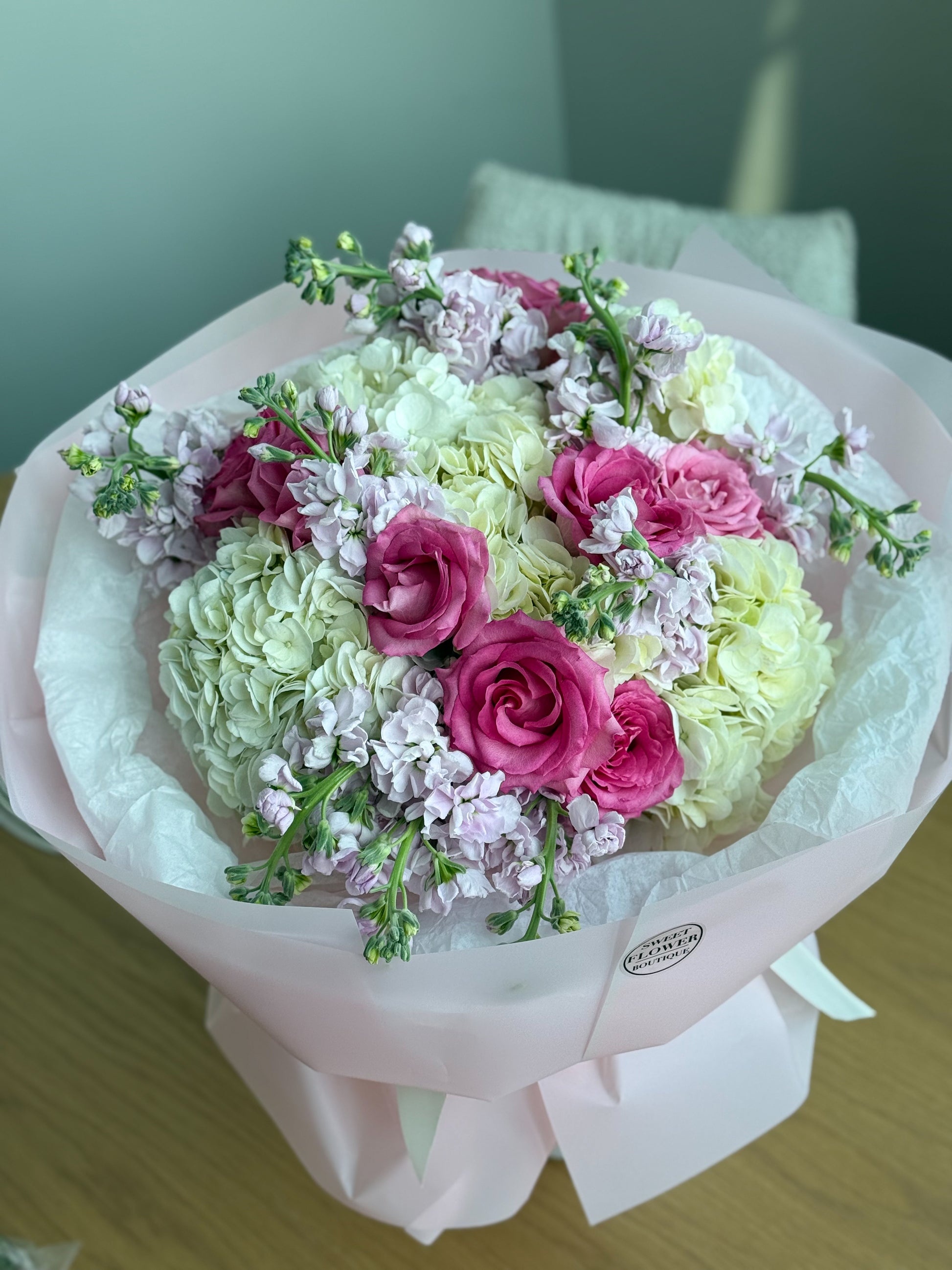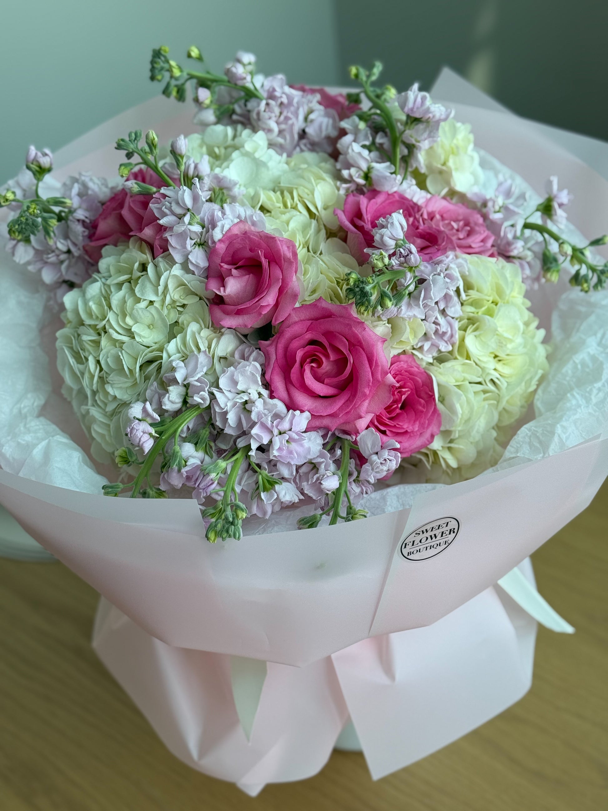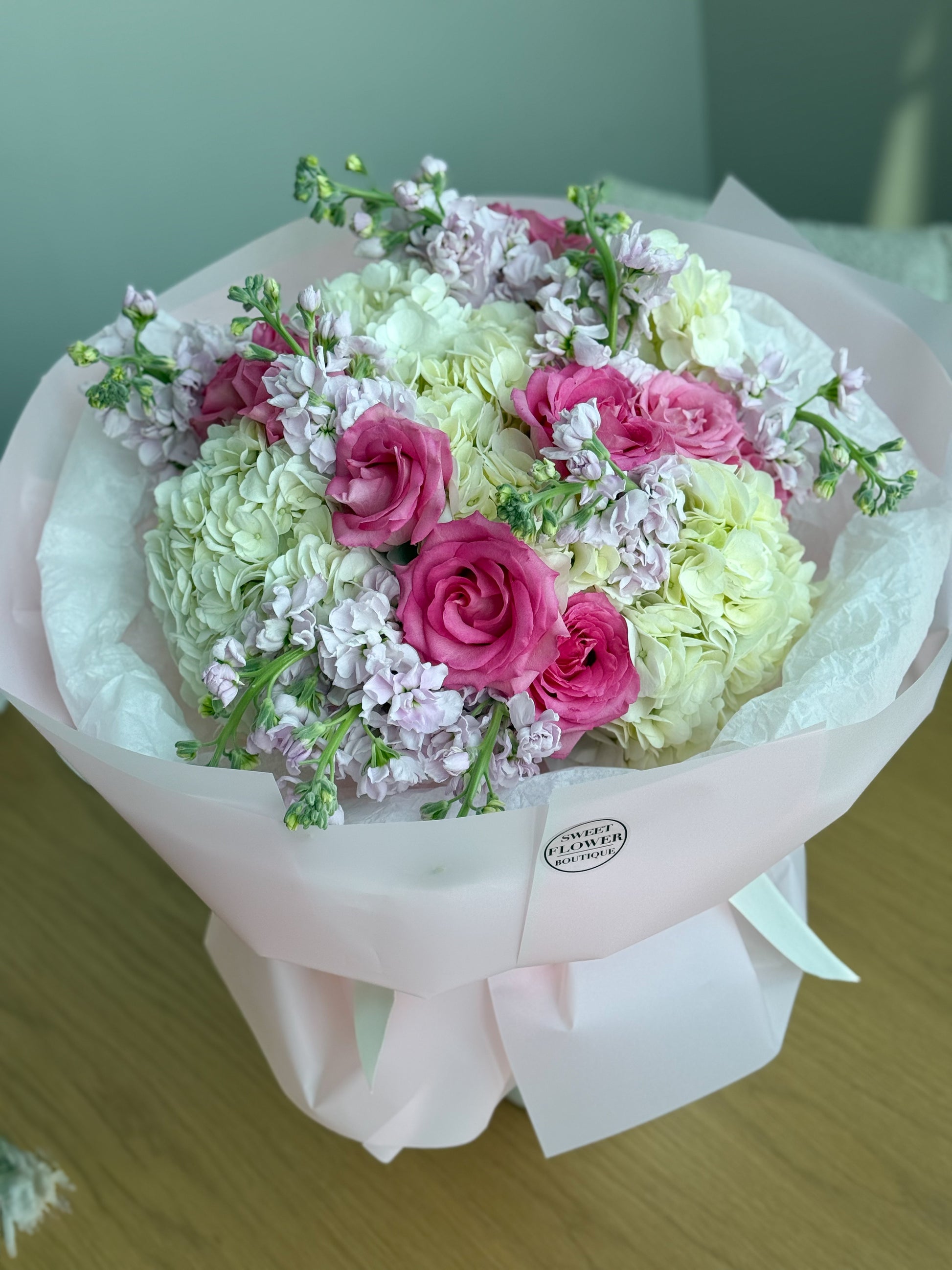 Surprise someone special with our Elegant Pink & White Bouquet, a luxurious hand-tied floral arrangement crafted by the experts at Sweet Flower Boutique. Featuring a stunning blend of lush white hydrangeas, vibrant pink roses, and fragrant lavender stock flowers, this bouquet is the perfect gift for birthdays, anniversaries, graduations, or just because.
