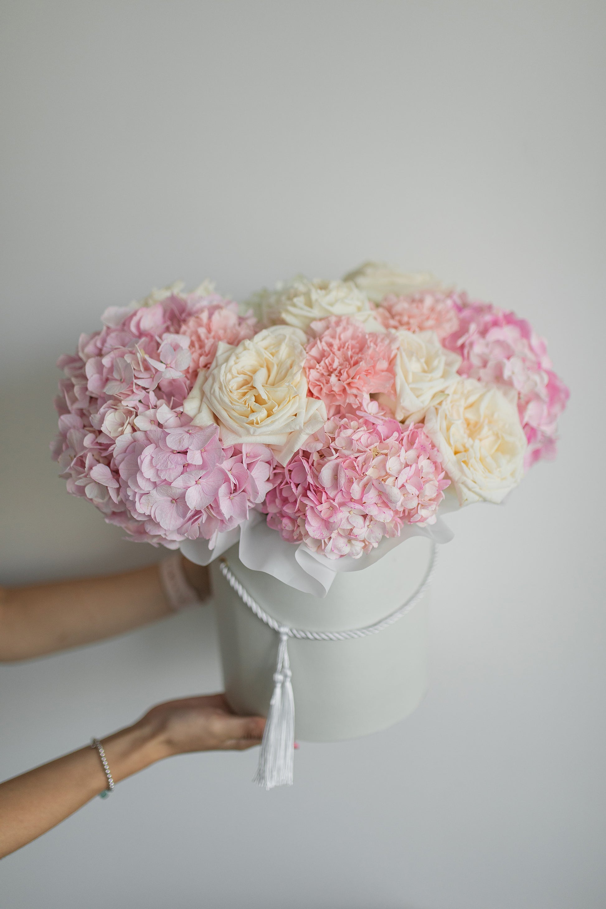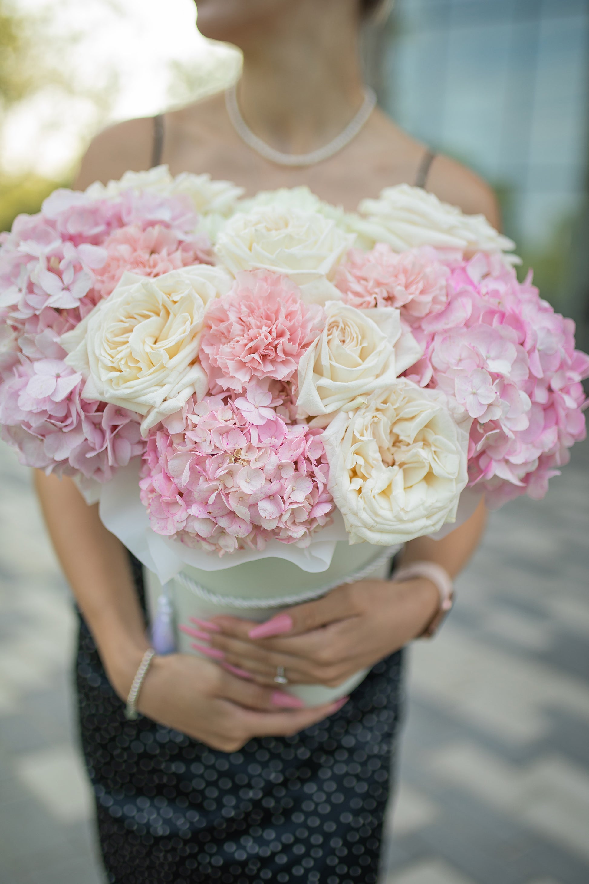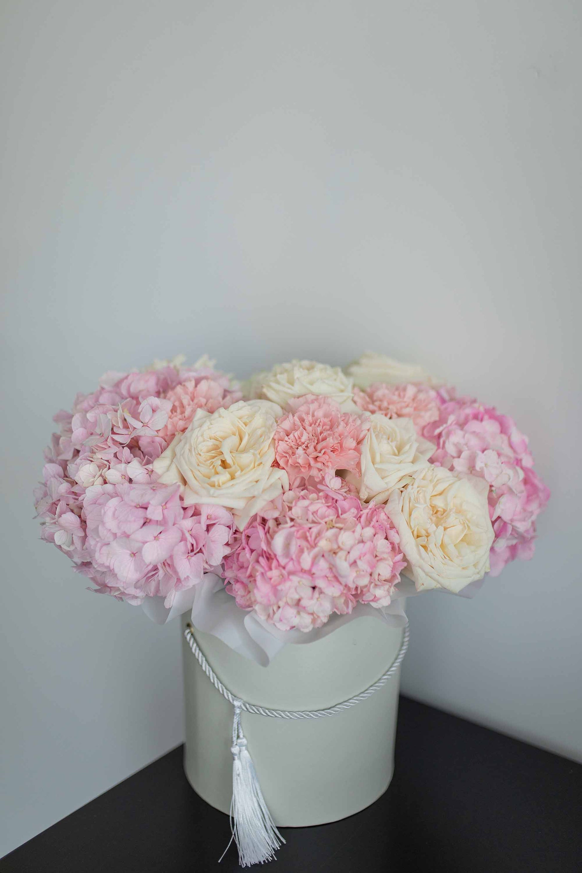 Pink volume hydrangea combined with beautiful white roses, pink and white carnations. Such a lovely flower box will surprise anyone.