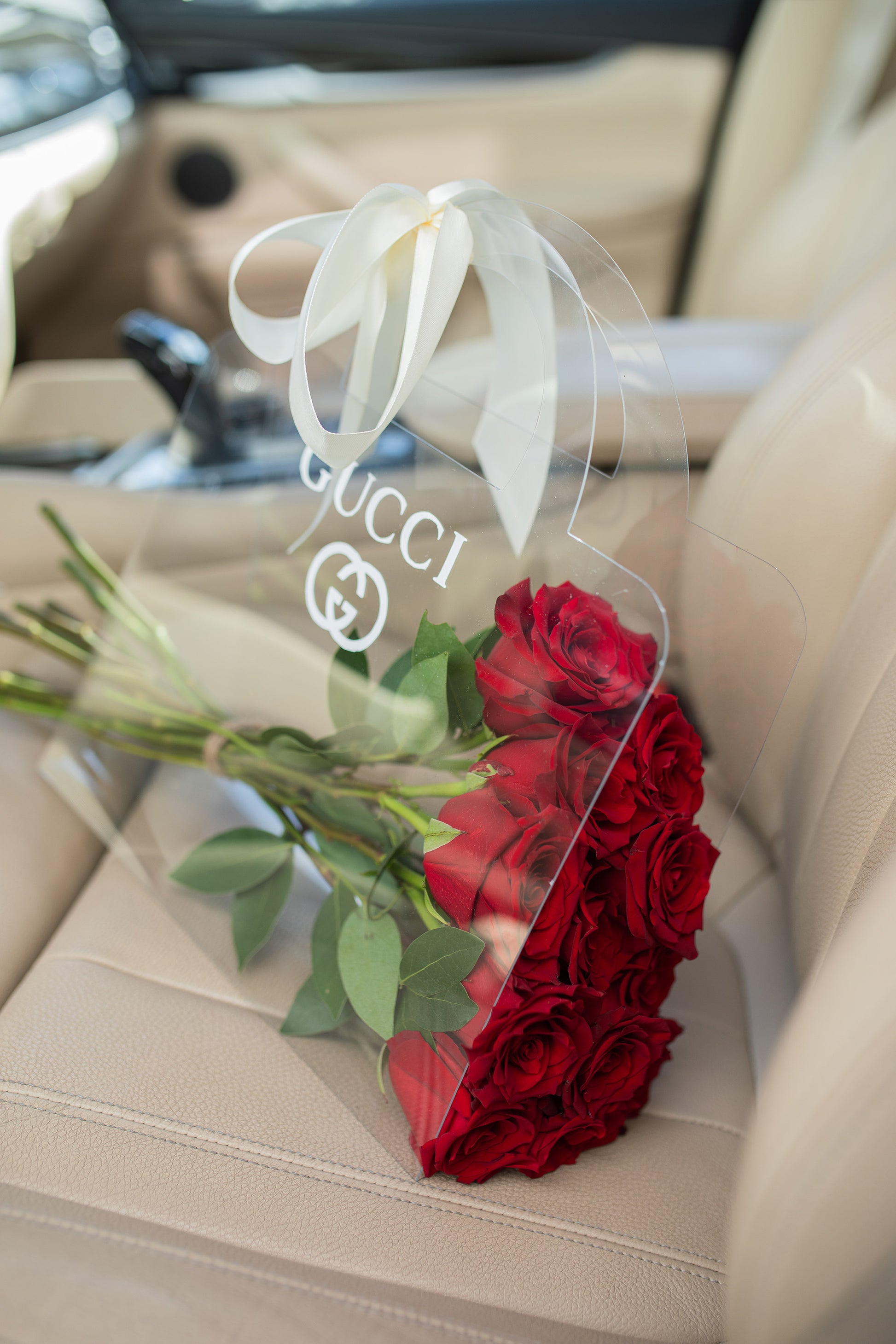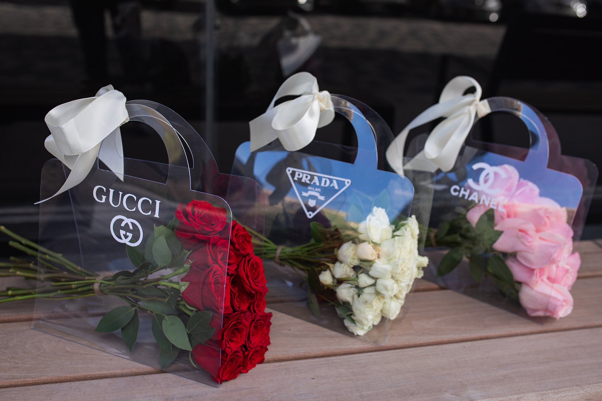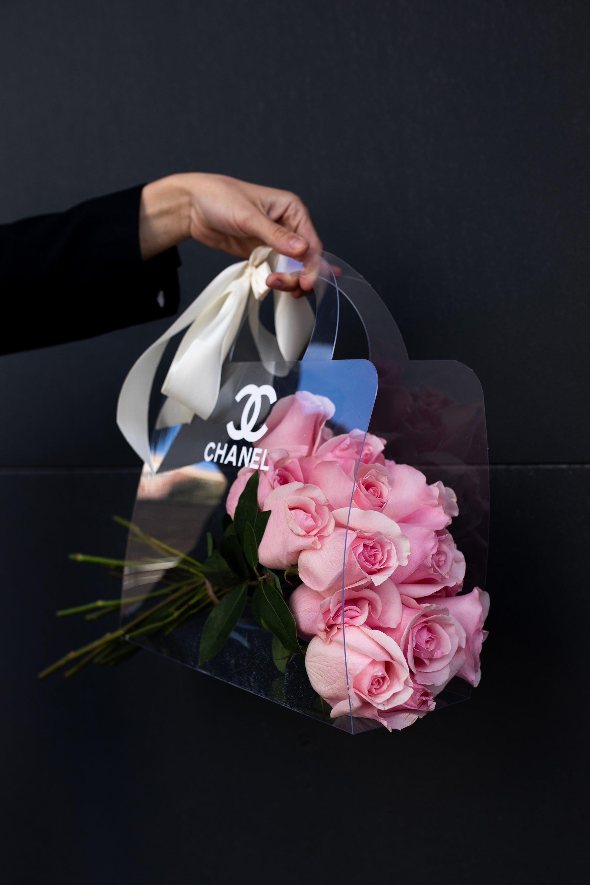Unique flowers packaging, exclusively available in our store. Premium quality roses in a clear bag with famous logo sticker. Just choose the quantity of roses and the brand logo you'd like.