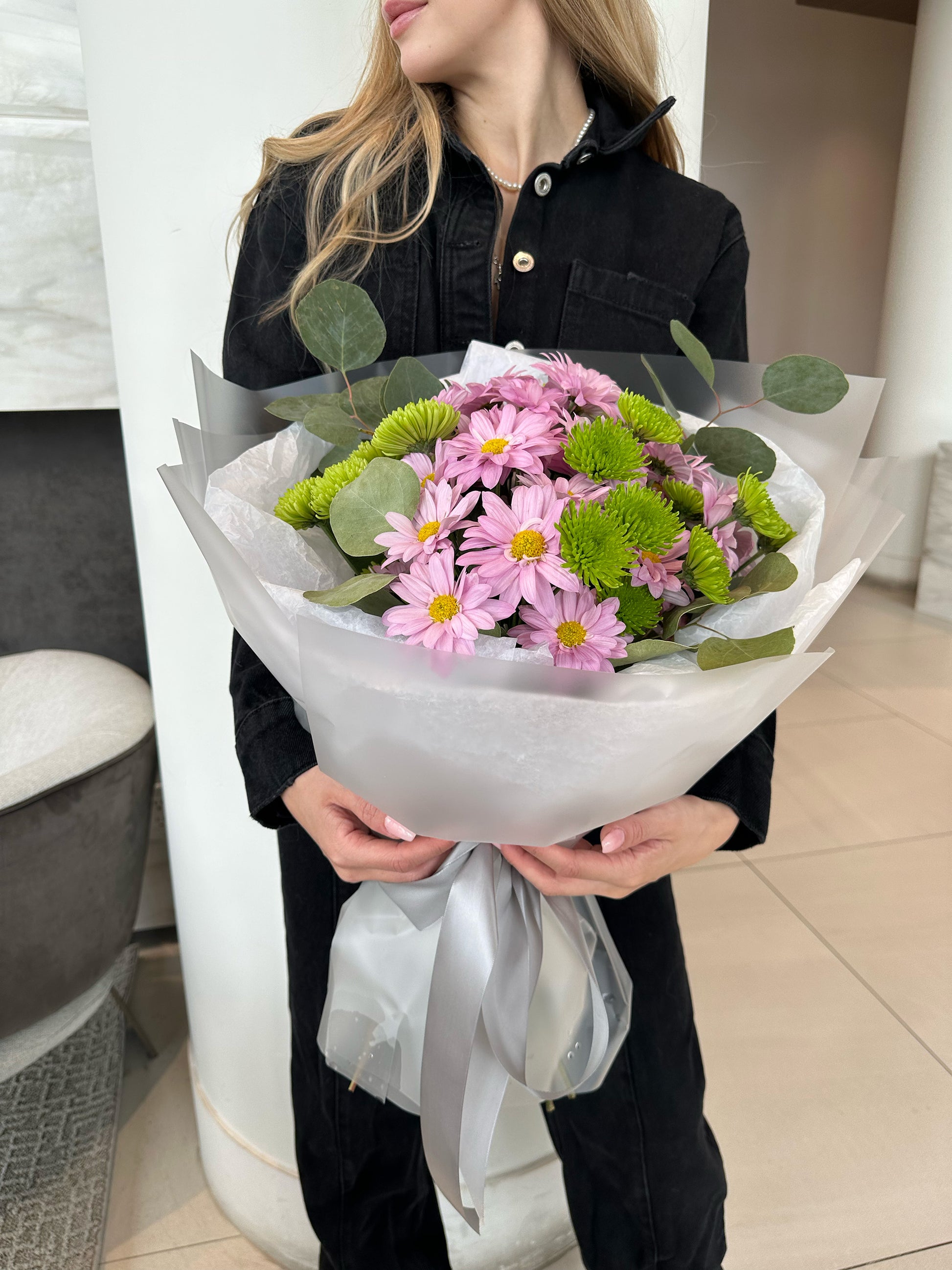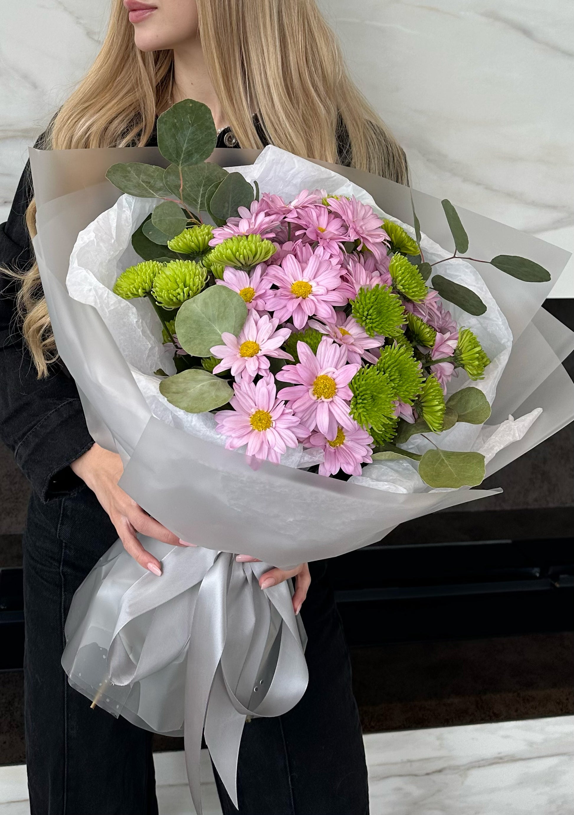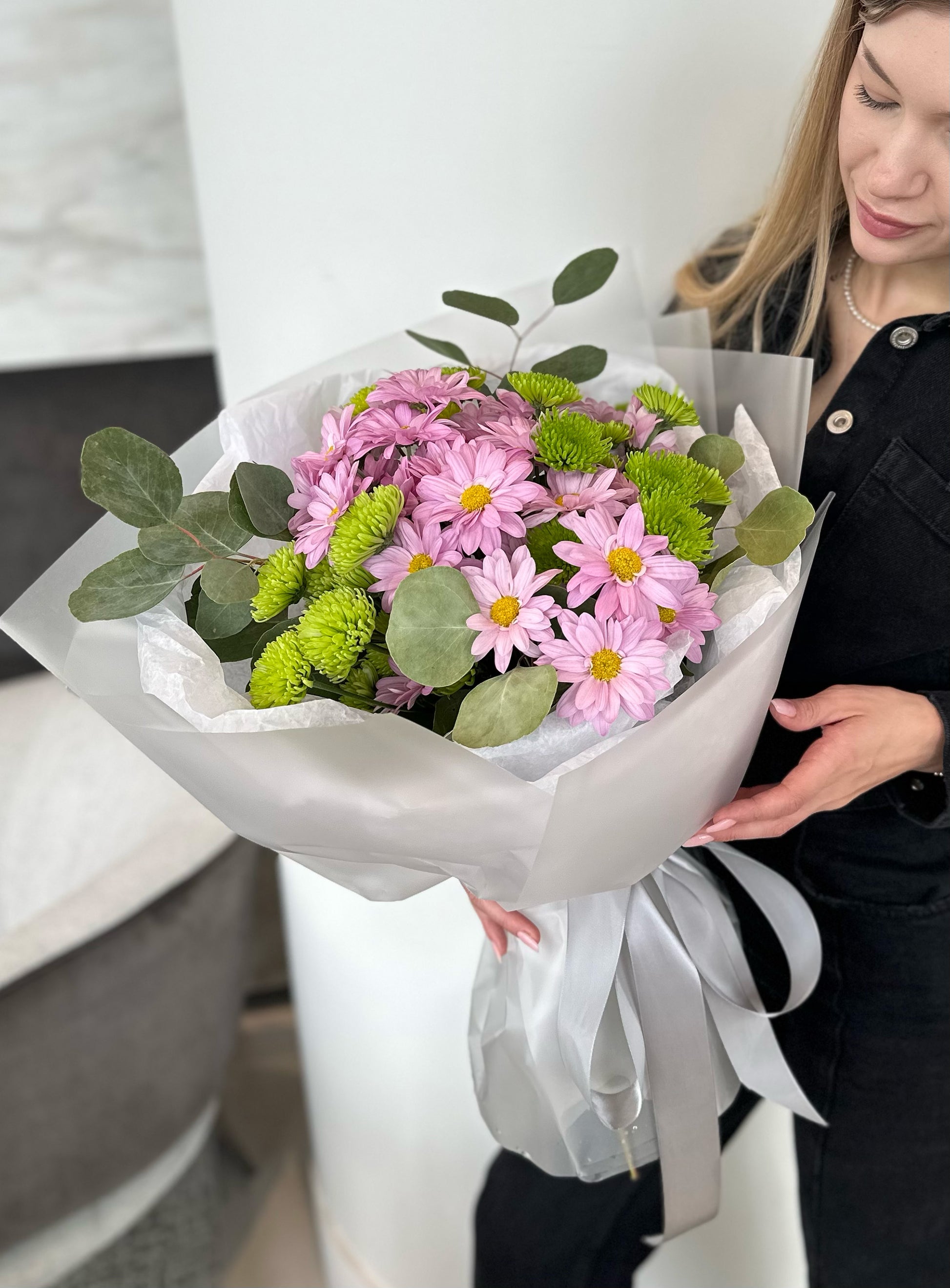 Pink and fluffy green chrysanthemums mixed with fresh eucalyptus. Very fragrant and long-lasting flower bouquet. This flower arrangement will make your loved ones smile.