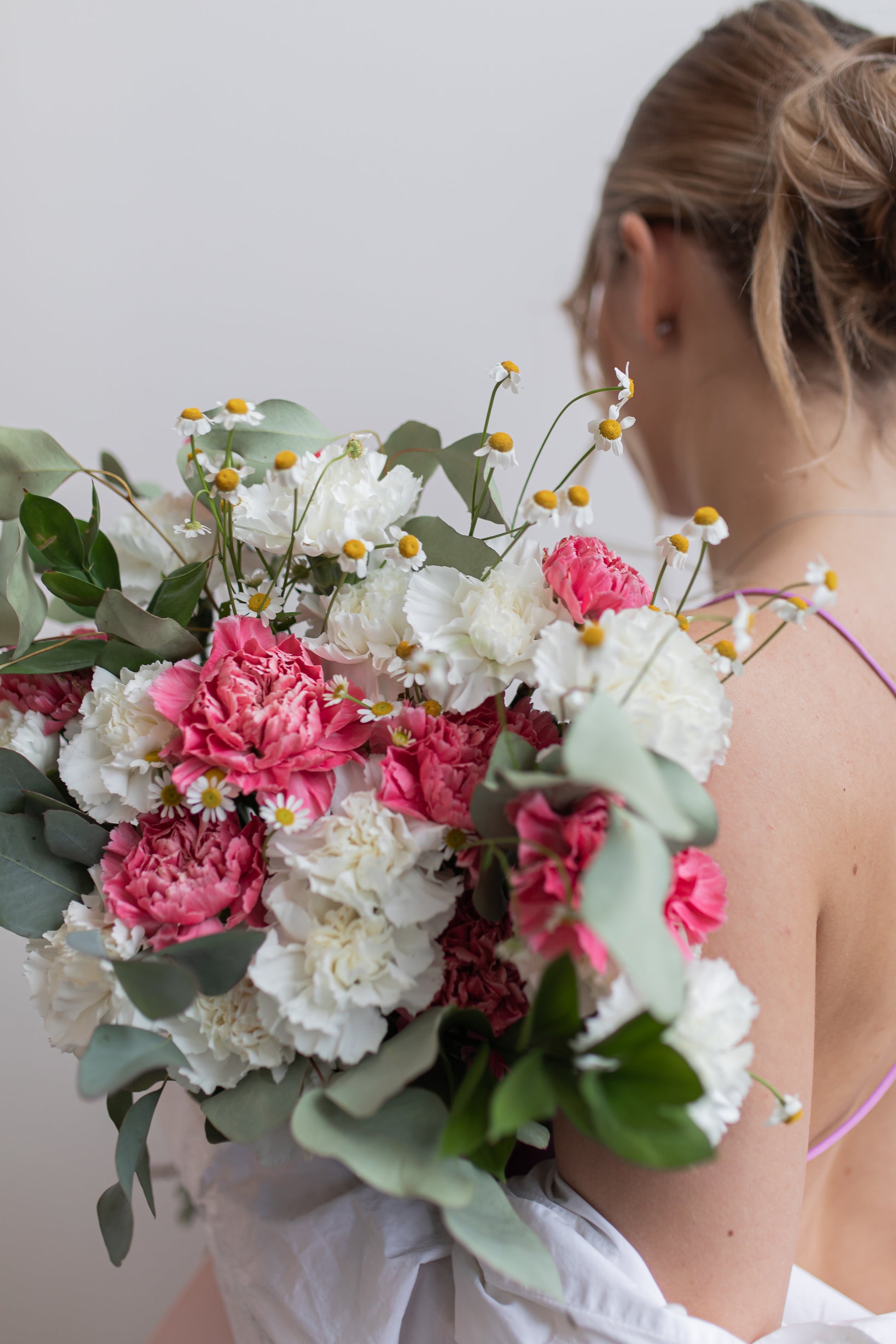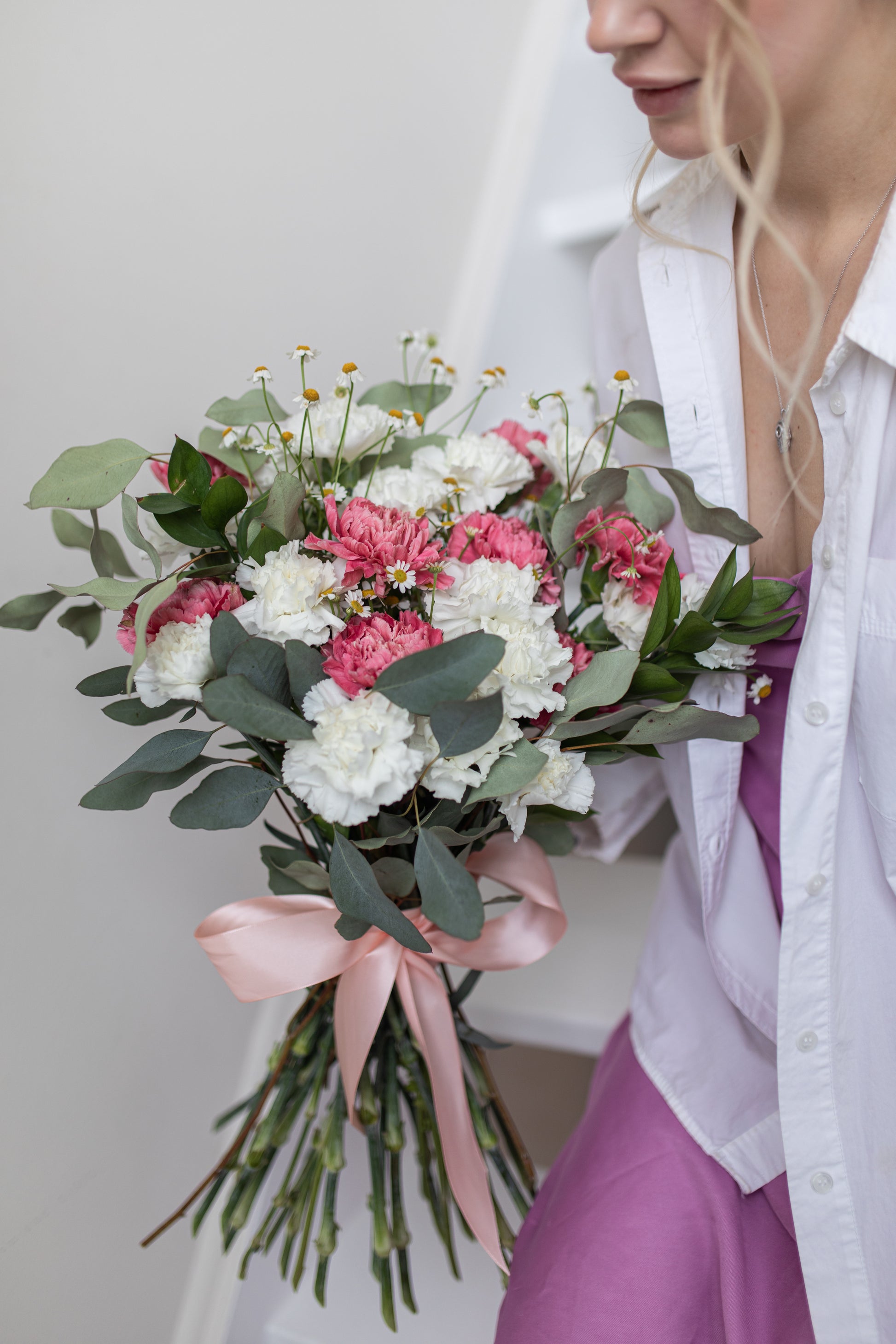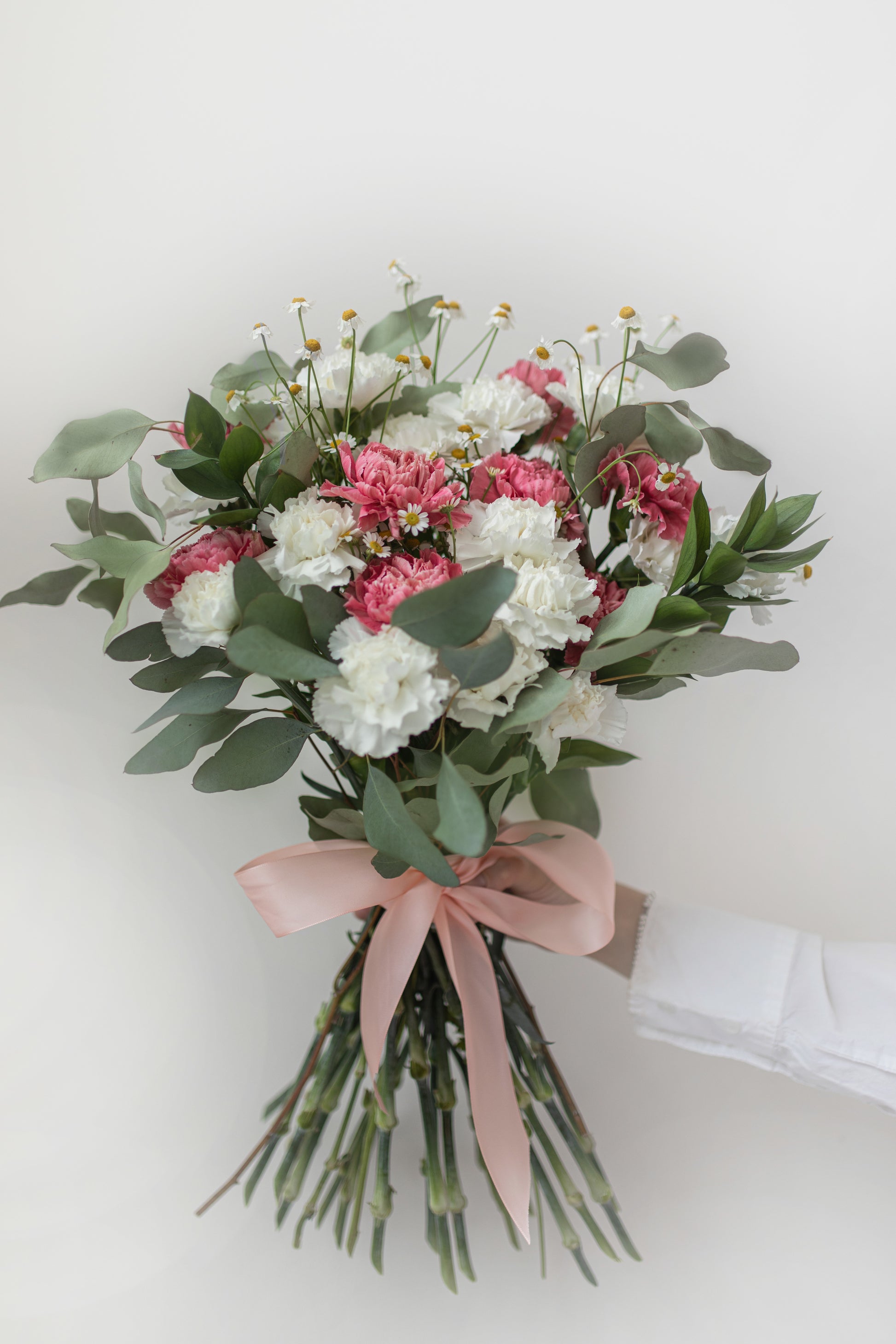 A beautiful mix of pink and white carnations with camomile flowers. Green leaves added to the arrangement making it very trendy.