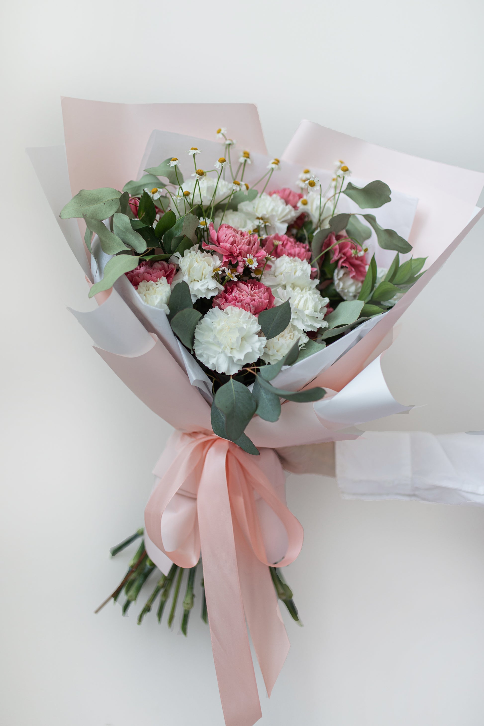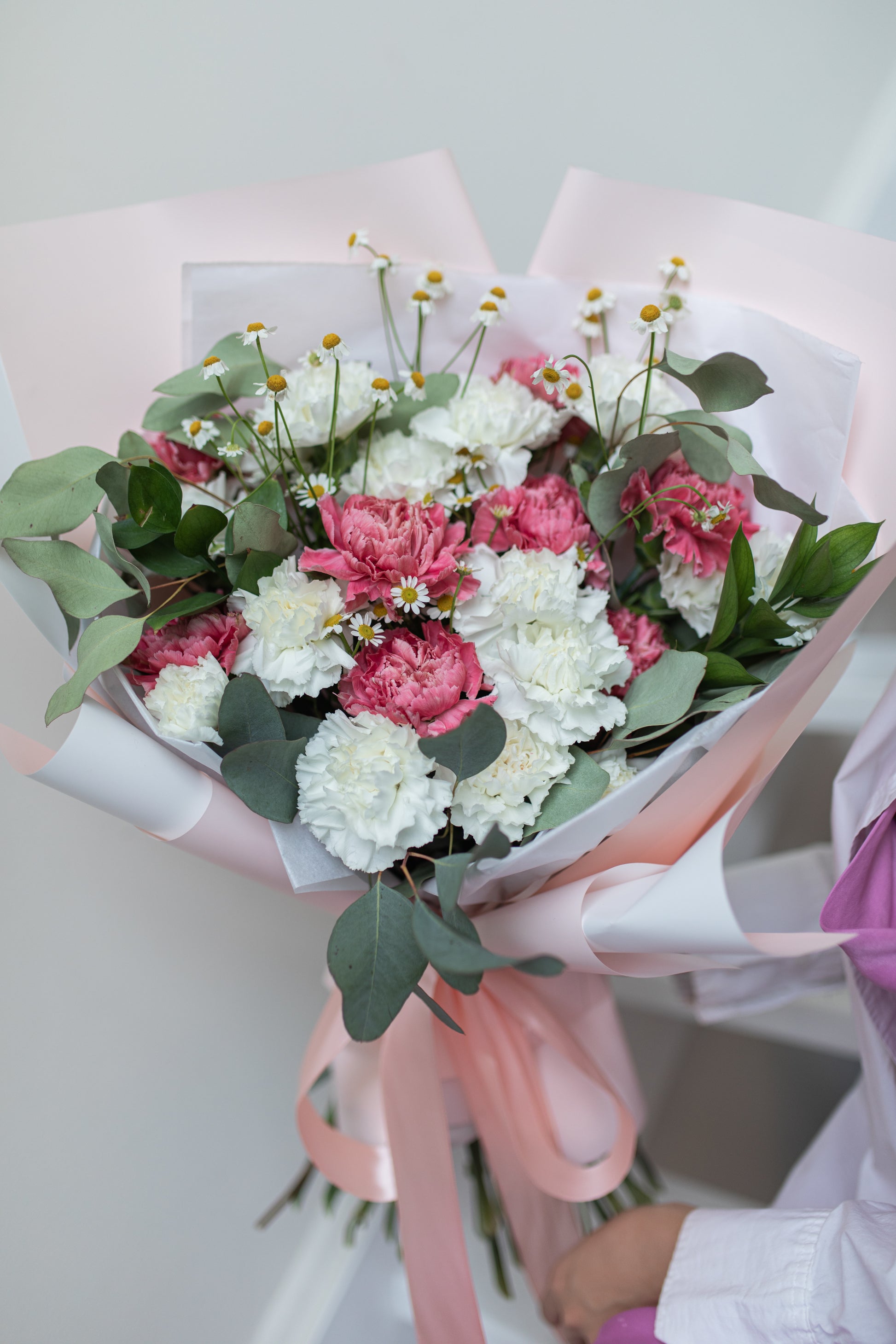 A beautiful mix of pink and white carnations with camomile flowers. Flowers are wrapped in light pink waterproof paper.