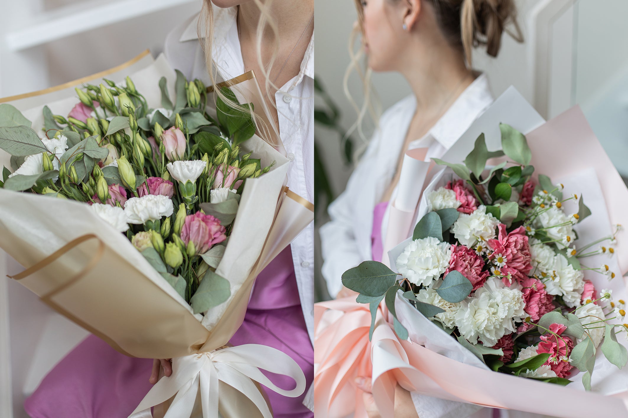 Fresh seasonal flower arrangements wrapped in trendy waterproof paper.